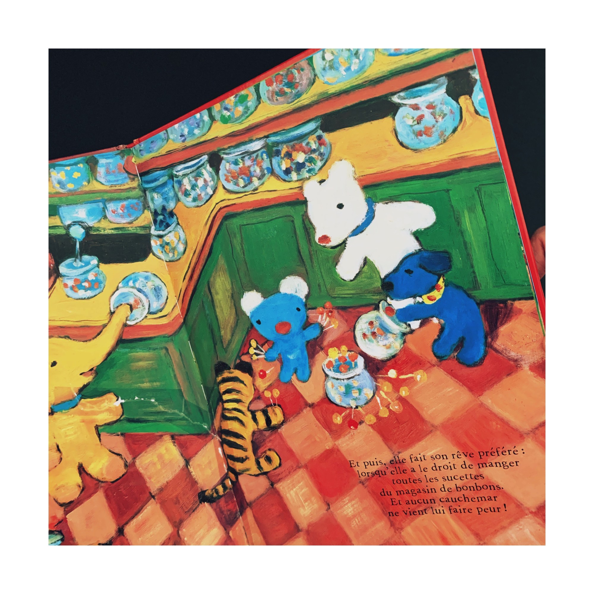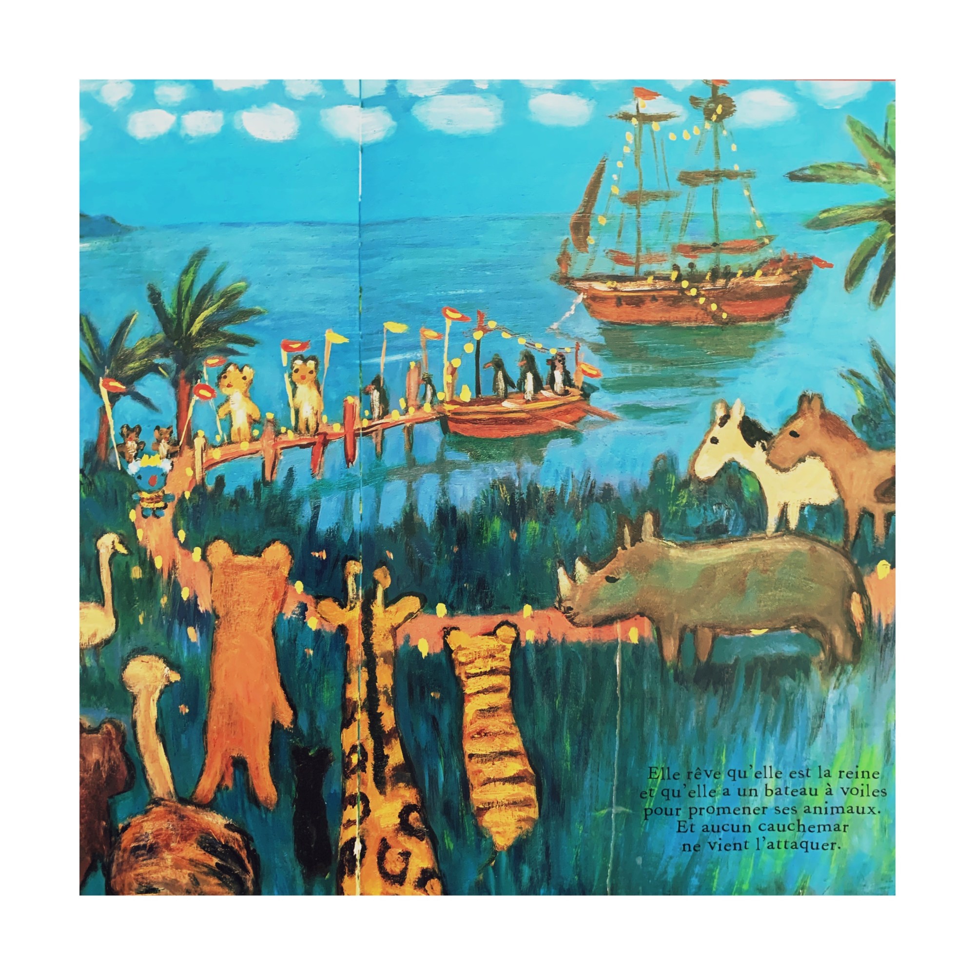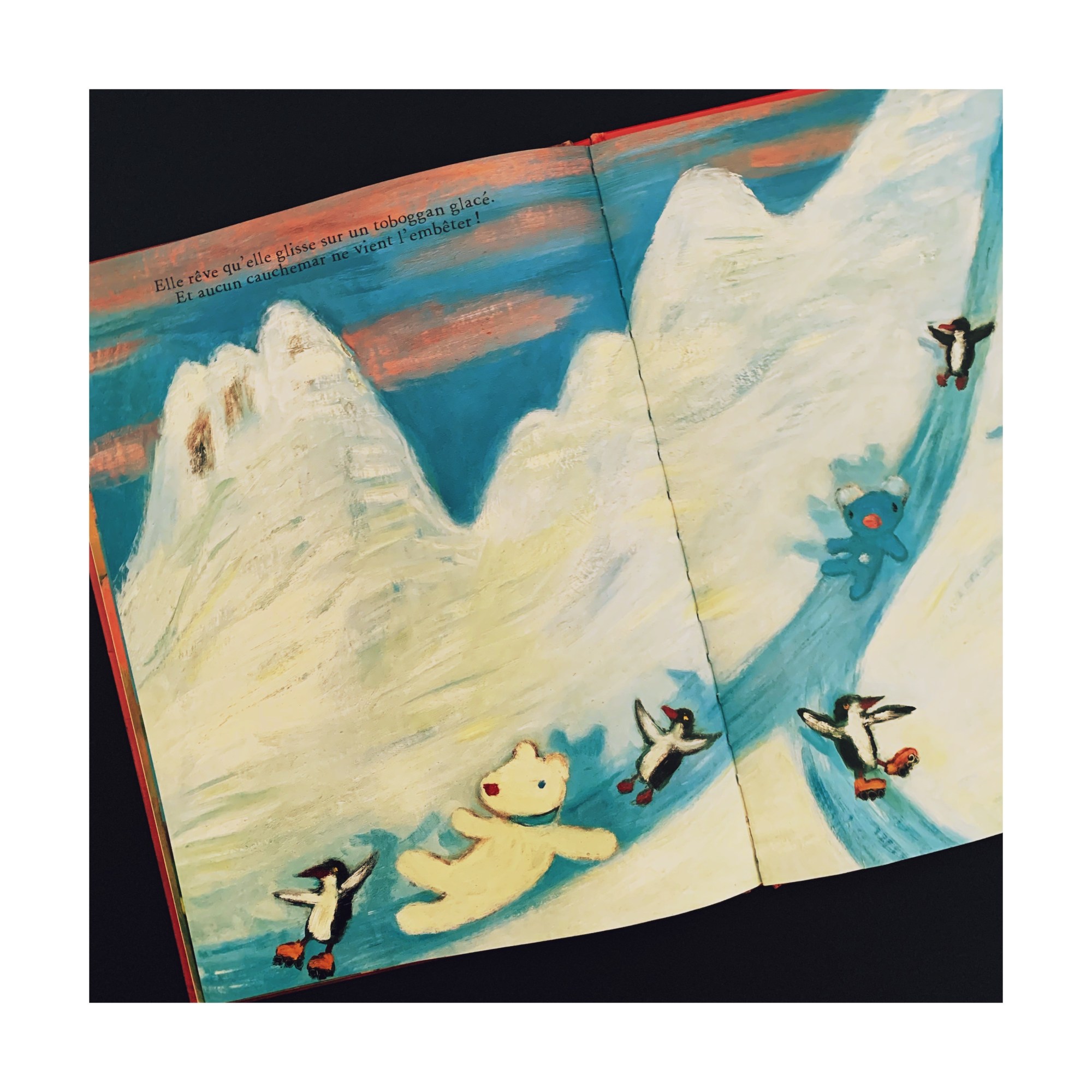 C’est alors que le papa de Pénélope retrouve un très vieux livre, recouvert d’une poussière dorée. Le livre anti-cauchemar. Il pratique alors la formule magique en déposant la poussière juste aux bons endroits. Et Pénélope s’endort aux pays des rêves merveilleux…. des œufs de poule en chocolat, des promenades à dos de mammouth, des glissades dans la banquise avec ses amis les pingouins, des magasins remplis de bonbons et de devenir la reine des animaux.