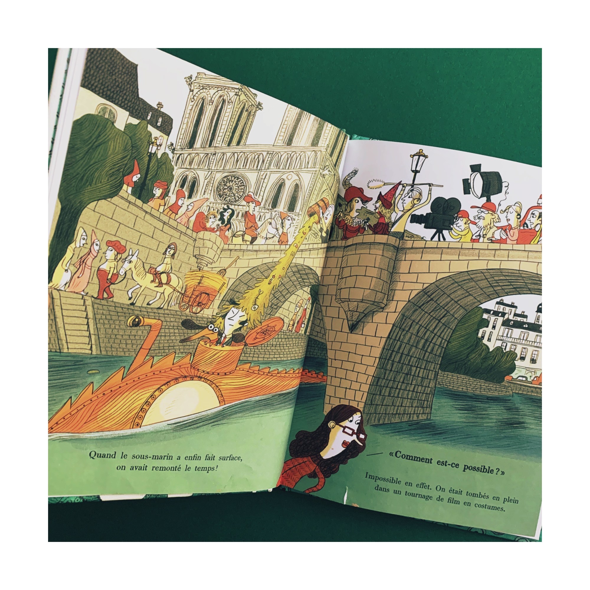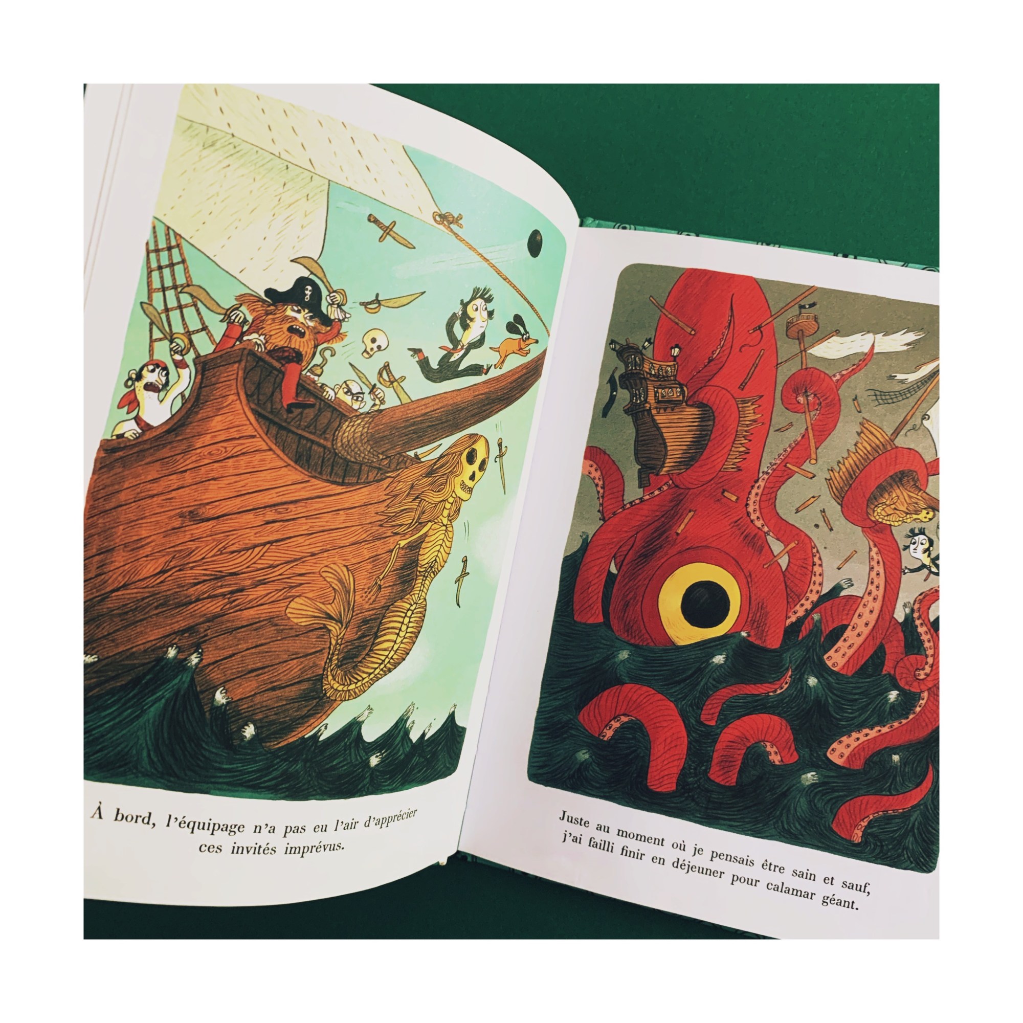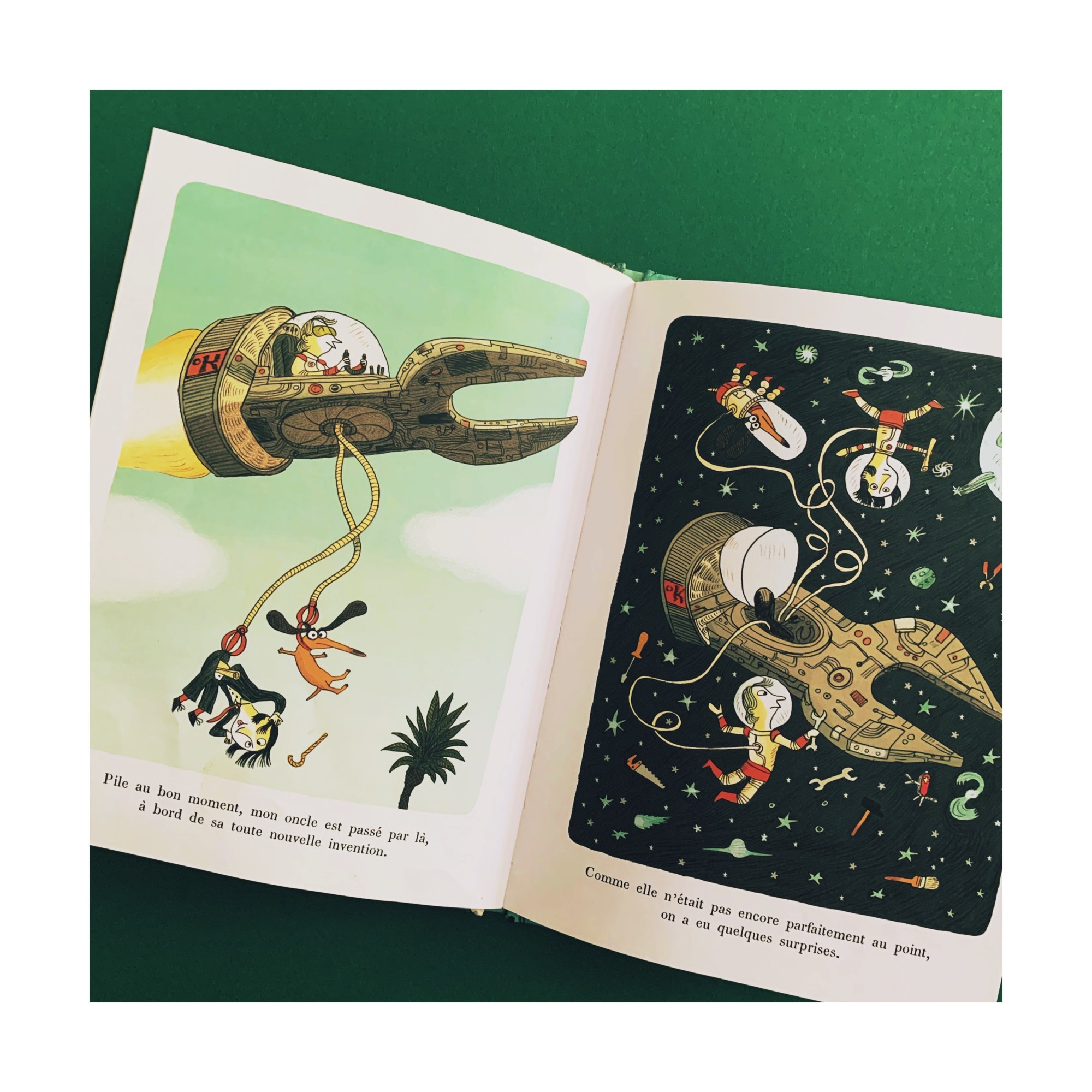 On retrouve un peu de Jules Verne, de Mary Poppins et de Robinson Crusoé dans ce livre rempli d’aventures plus loufoques les unes que les autres! Les dessins sont géniaux, super colorés, remplis de détails et d’actions, et on a envie de se plonger dedans pour vivre nous aussi ces incroyables vacances, chaque planche nous faisant partir un peu plus loin dans notre voyage imaginaire !