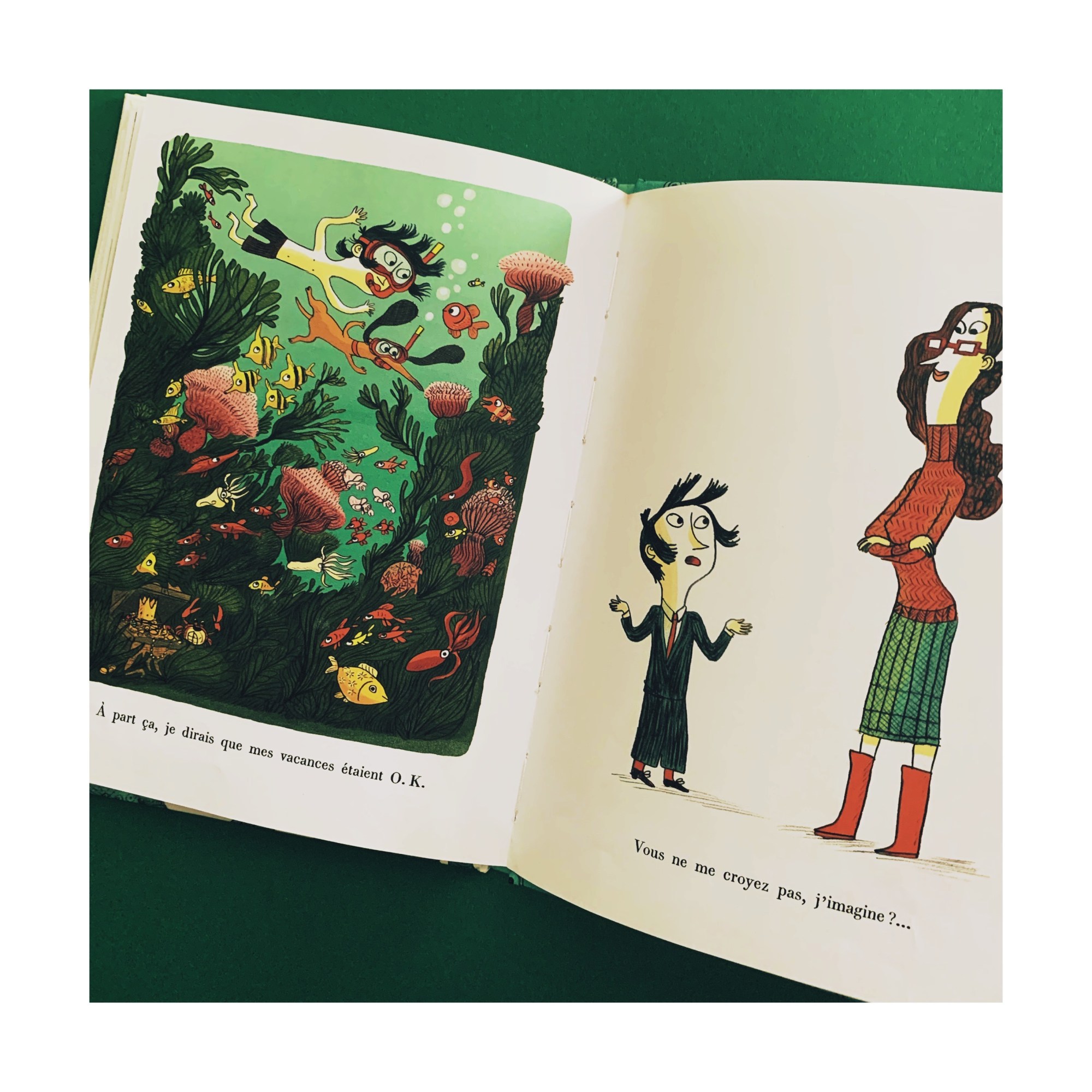 Voilà commence ce joli livre qui nous fait dépasser les limites de l’imaginaire. Une maîtresse qui demande à son élève de lui raconter ses vacances… mais elle ne s’attend sûrement pas à ce qu’il va lui raconter (quoique…. ?).