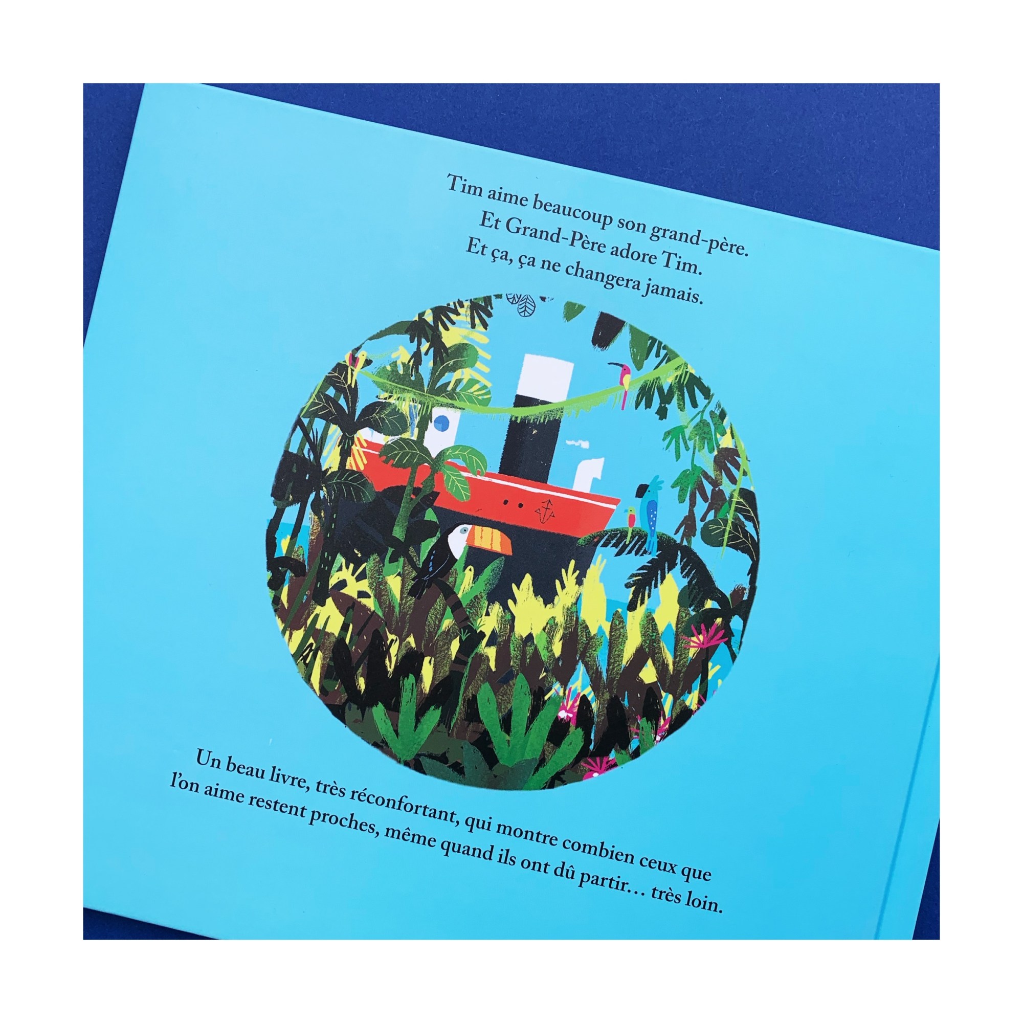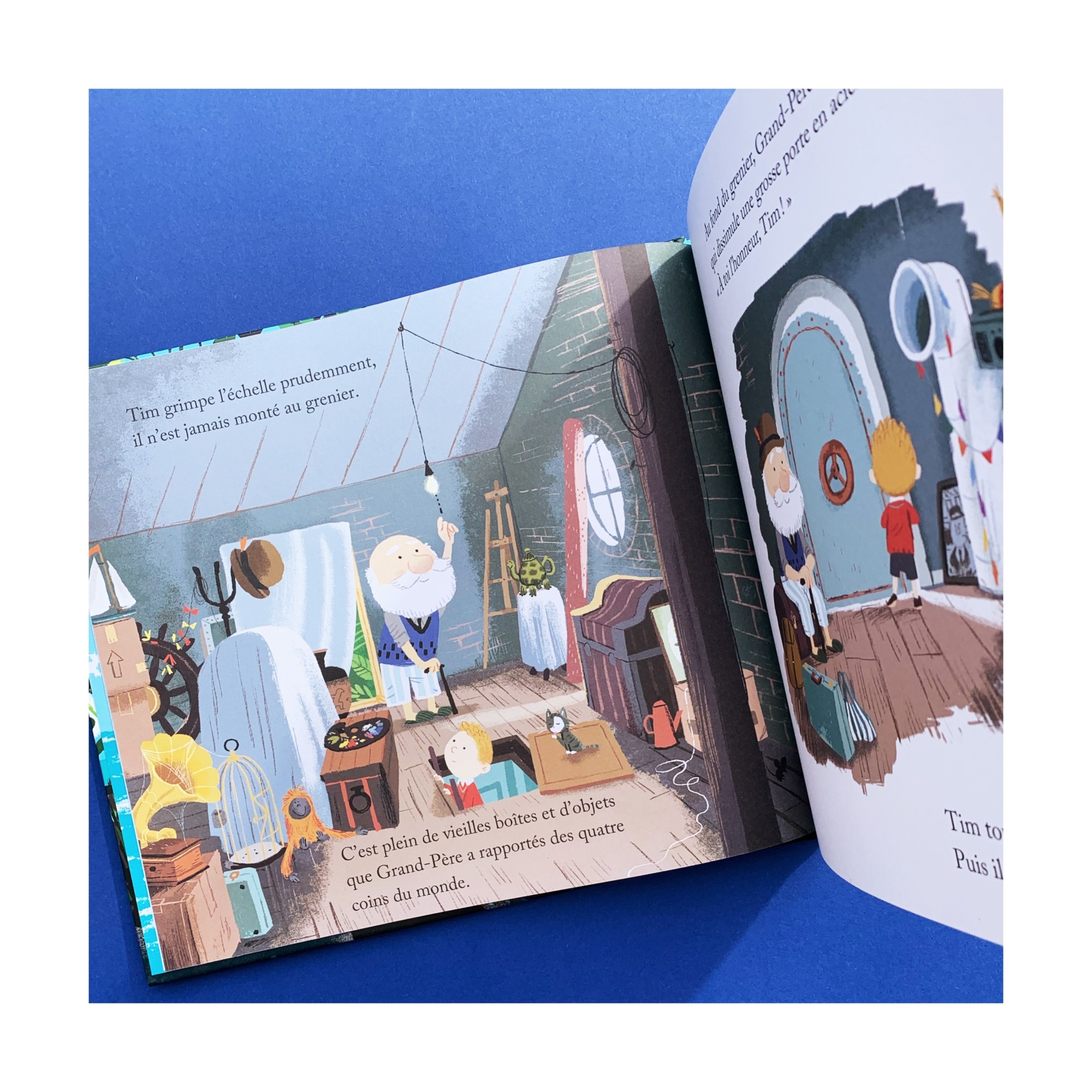On suit Tim lorsqu’il rend visite à son grand-père dans sa jolie maison, sans réussir à le trouver. Il le découvre au grenier, au milieu de souvenirs d’une vie. Et puis c’est l’aventure : Tim et Grand-Père s’enfuient par une porte dérobée à bord d’un paquebot qui les emmène au grand large. Sur l’île merveilleuse où ils accostent, c’est le paradis! Ils y passent des moments de complicité sans pareille, et y construisent une maison fabuleuse.