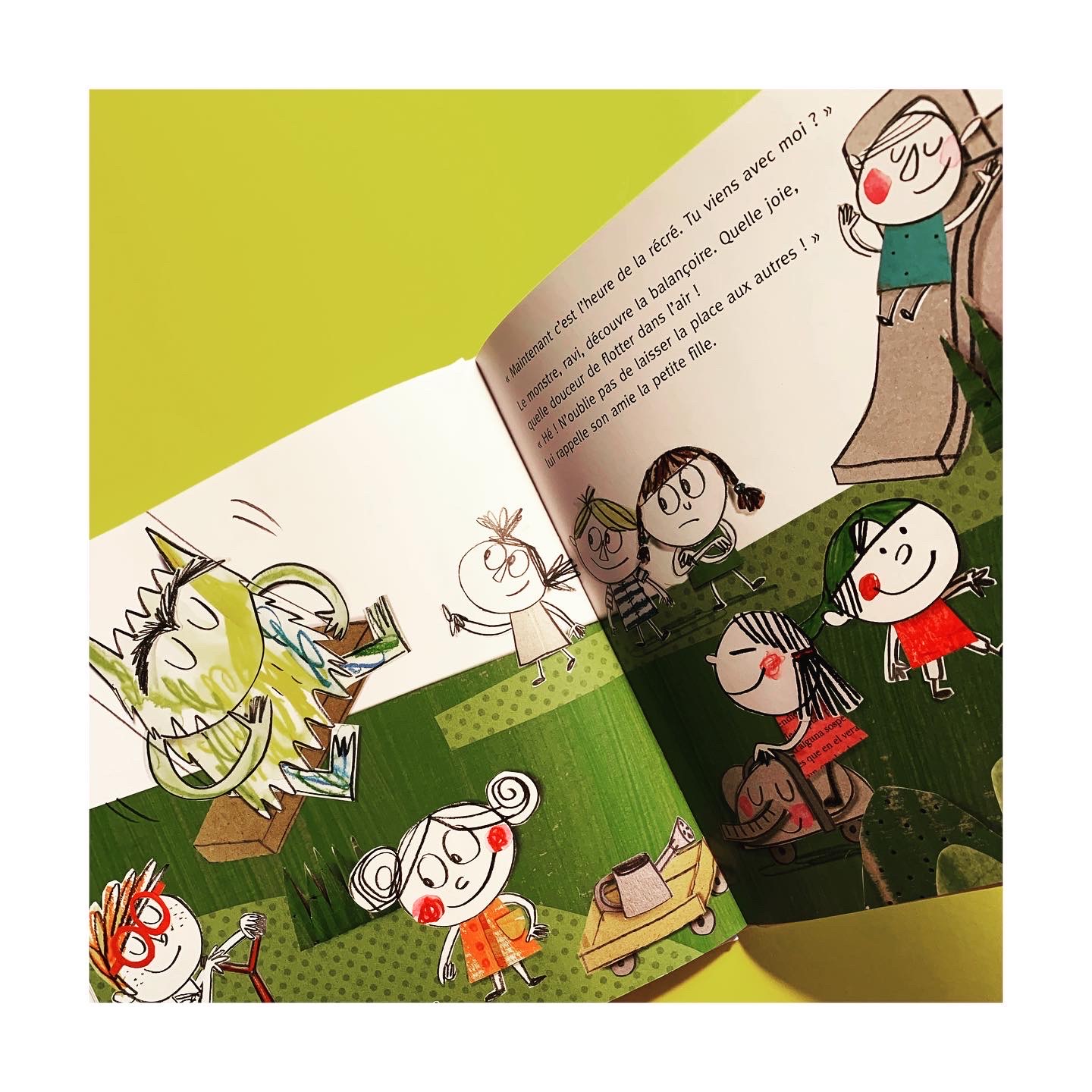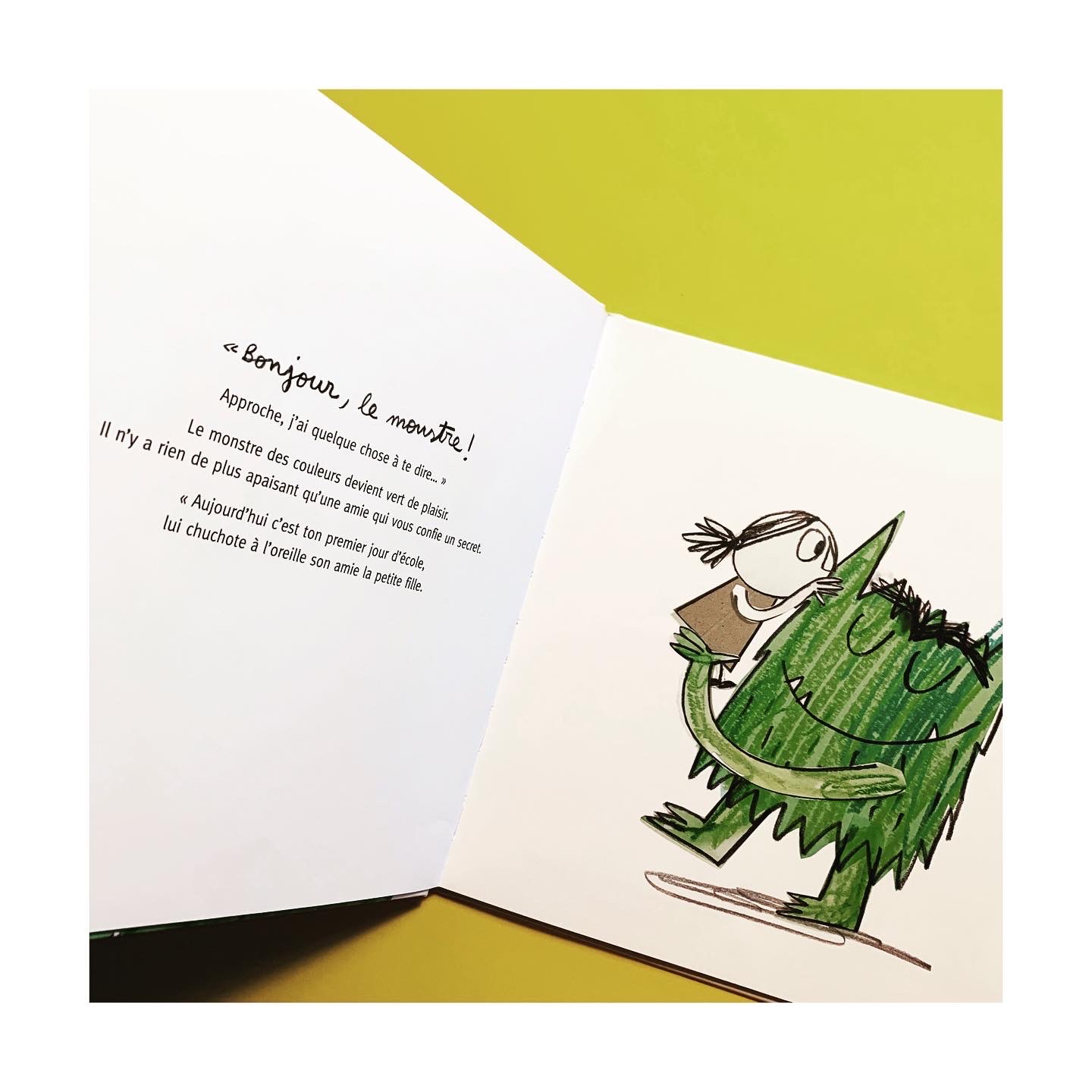 Ici, grâce aux couleurs successives que revêt notre gentil Monstre, l’enfant peut super bien s’identifier à lui et comprendre les émotions qui le gagnent avant et pendant son premier jour à l’école aux côtés de son amie la petite fille. L’appréhension, la joie, la timidité, l’excitation : tout ce qui fait la nouveauté ! Et finalement – ouf ! – le Monstre est bien plus souvent tout jaune que noir ou bleu.