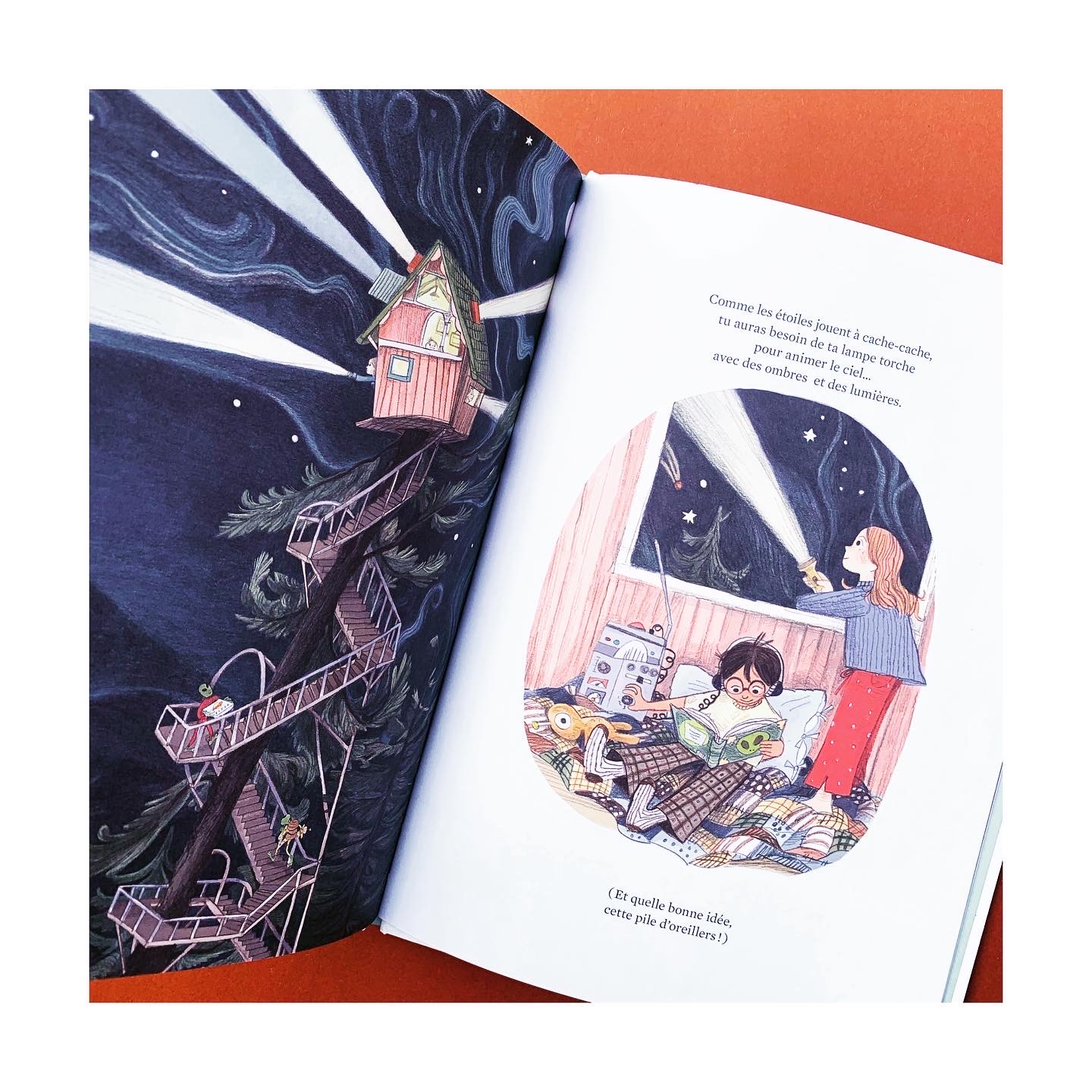Entre les deux, plein d’idées d’évasion magnifiquement illustrées. Des envies d’ailleurs ou de cocooning, de fête et de flâneries, de rencontres et de solitude, d’ombre et d’étoiles aux lumières sublimes et aux dessins colorés remplis de détails surprenants. On part dans les forêts de chez nous, dans la jungle, dans les palmiers, on croise des arbres tout maigres, des énormes, des longs, des hauts, des bas… et les cabanes sont de bric et de broc, de barques, de toiles et de verre. Et surtout plein d’enfants, des garçons et des filles de tous horizons.