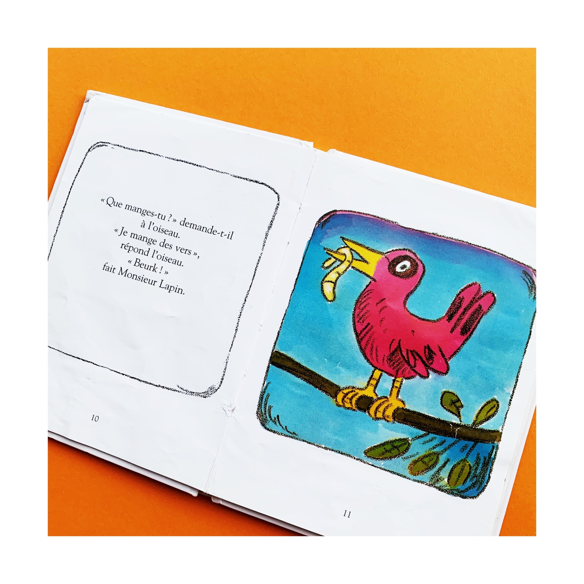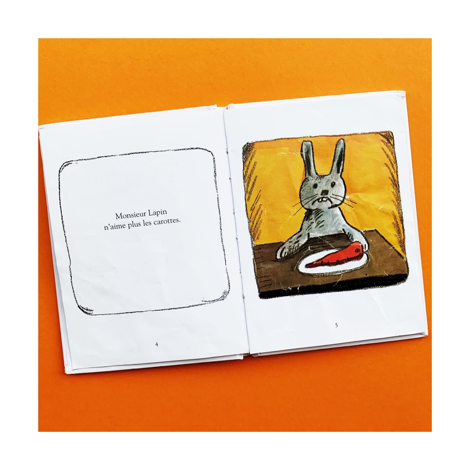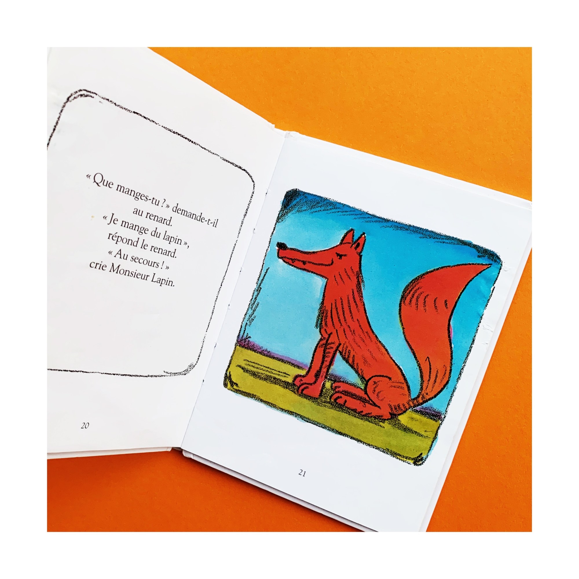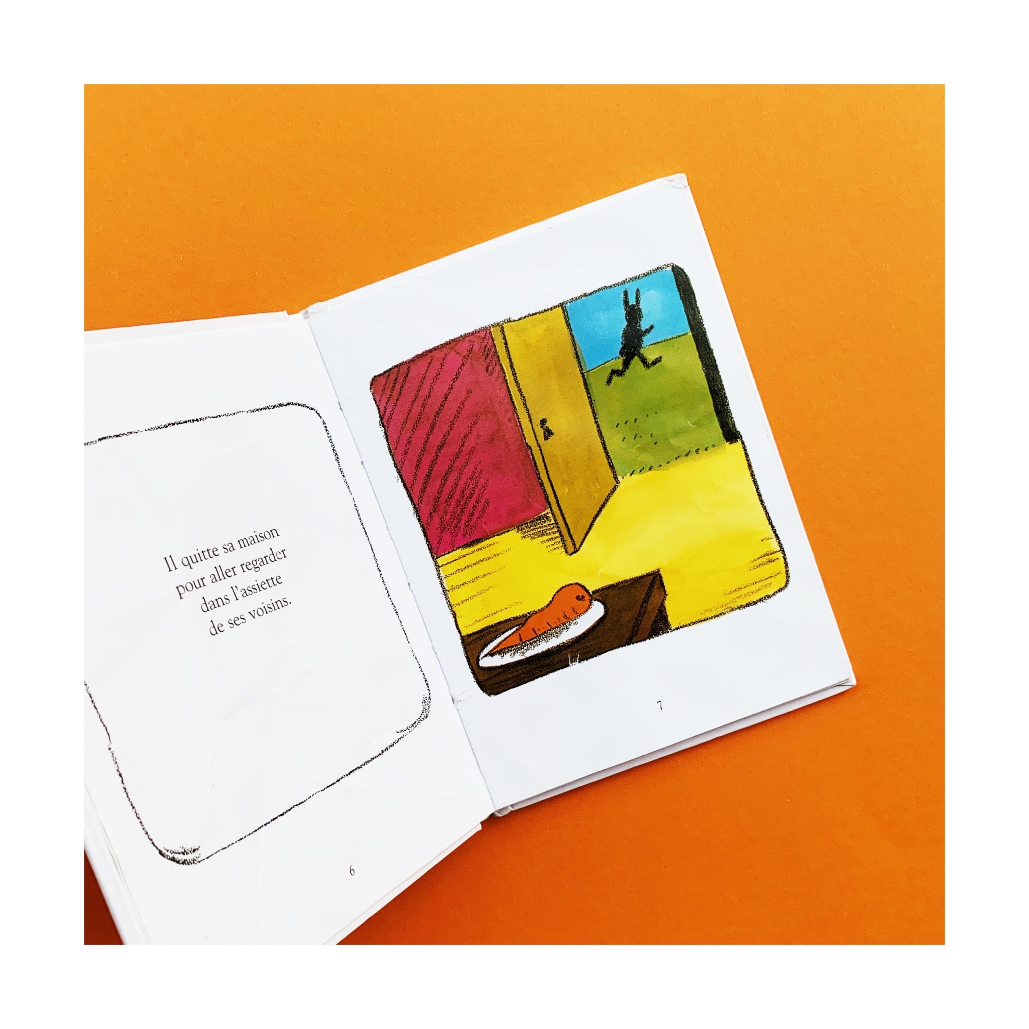 Et pourtant je me suis souvent demandé pourquoi. Un petit livre tout simple, à l’histoire assez basique : un lapin qui en marre des carottes (on peut le comprendre) et décide d’aller voir ce qui se passe dans l’assiette de ses voisins. Au fil de sa promenade et des découvertes alimentaires, il se rend compte que rien ne lui convient. Jusqu’au moment où il rencontre un renard qui lui explique ce qui constitue son repas… aïe aïe aïe ! Notre lapin a eu chaud aux oreilles ! Finalement les carottes c’est pas si mal…