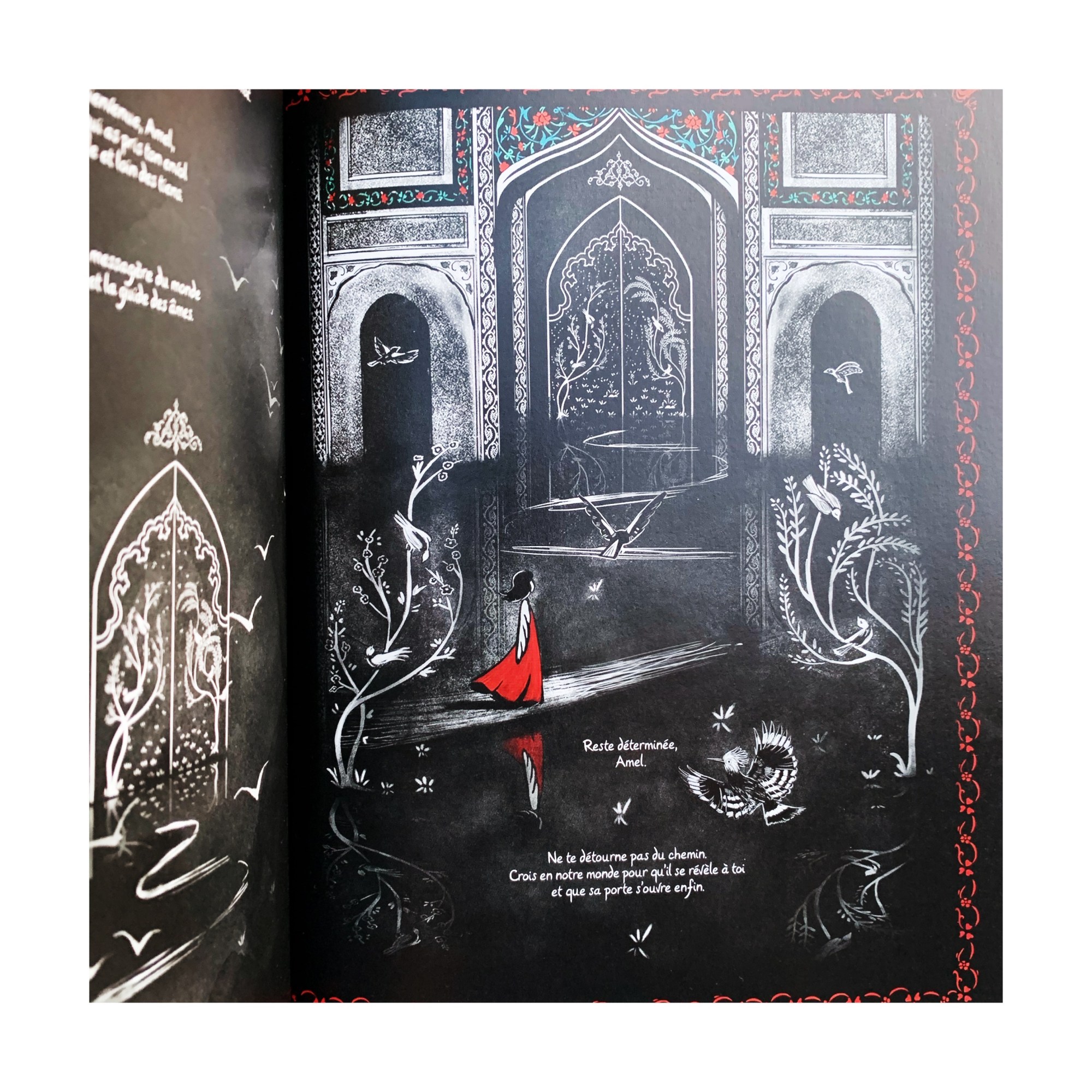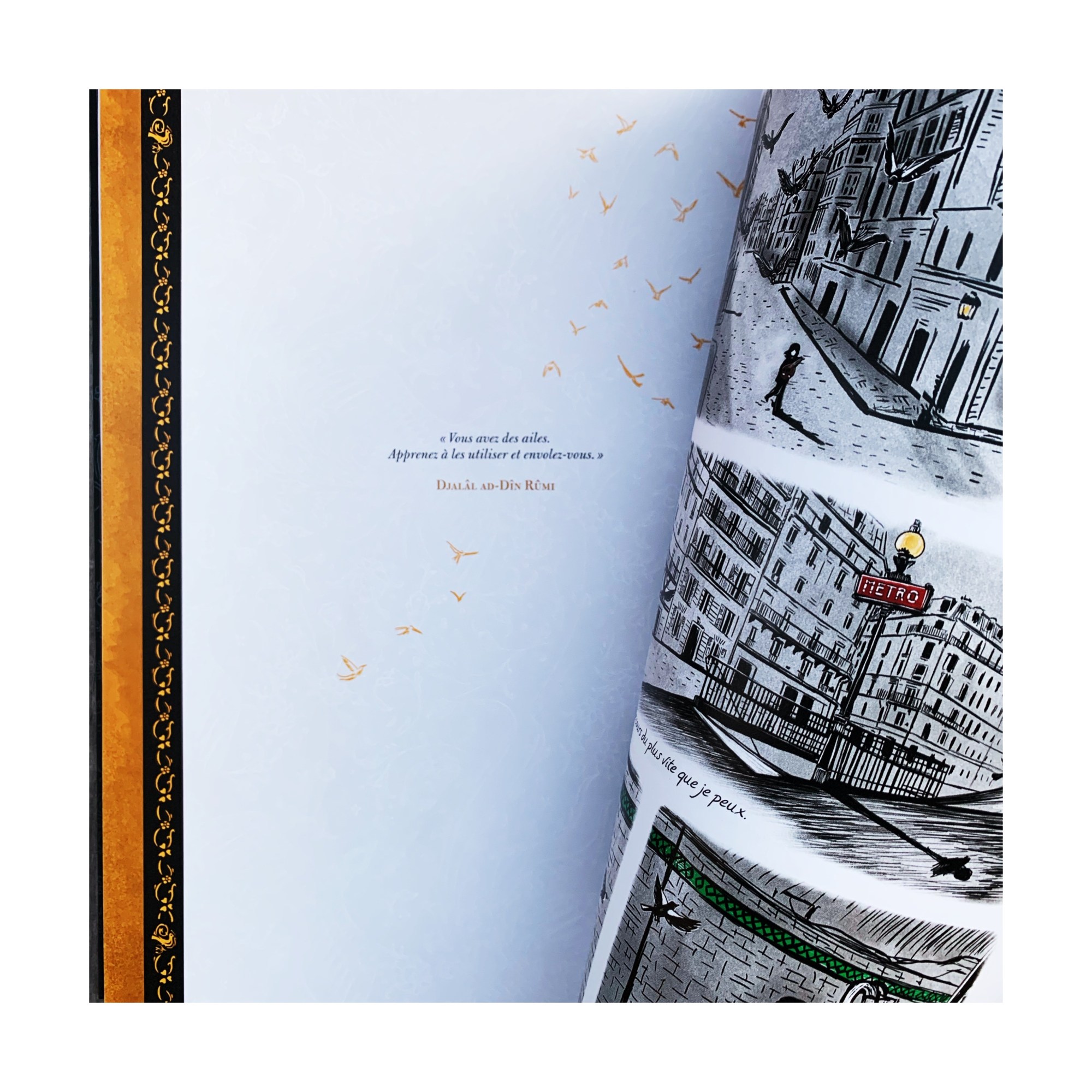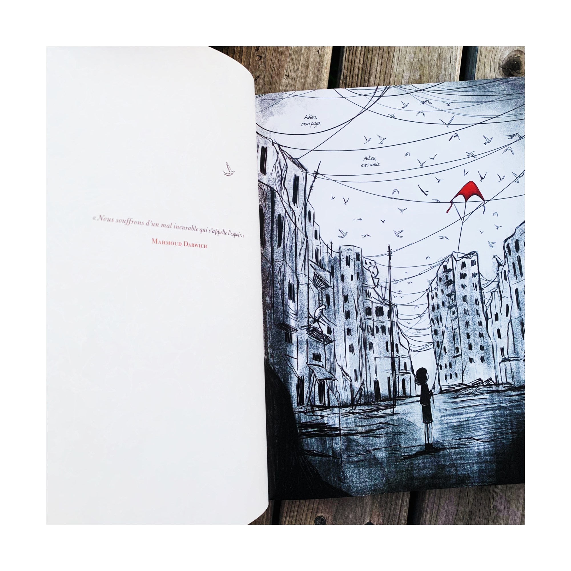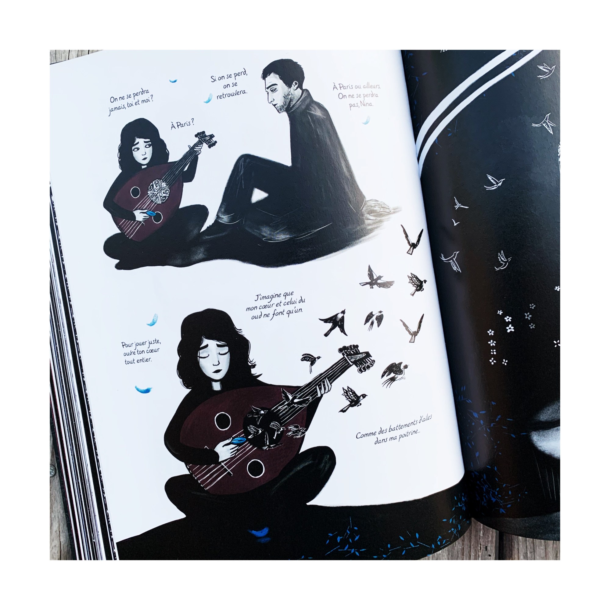 On fait la rencontre d’Amel, dont elle doit taire le nom en devenant Nina, fuyant son pays en guerre. Son pays qu’elle aime tant et où elle laisse ce qui lui reste de famille, sa Jeda et son Jedo. On suit son périple qui tangue entre la peur, l’abandon, la perte ou les rencontres. Celle d’avec la famille Hudhad, bienveillante, la belle Aïda ou Bacem et son oud, qui a choisi un autre chemin que celui qu’on lui imposait et devient son phare, son épaule. Grâce à sa force et à ses anges gardiens qui lui apparaissent sous formes d’oiseaux enchanteurs, symboles de toutes ces âmes qui cherchent à s’envoler, Amel poursuit sa route, jusqu’à apercevoir l’éclaircie inespérée. Jusqu’à se trouver elle-même.