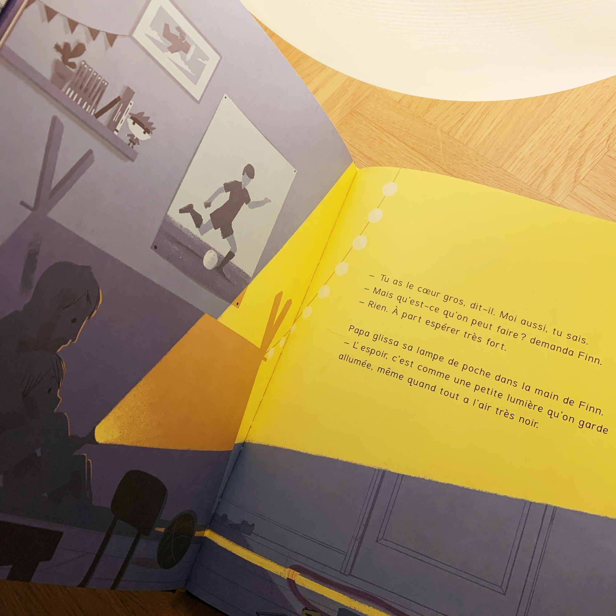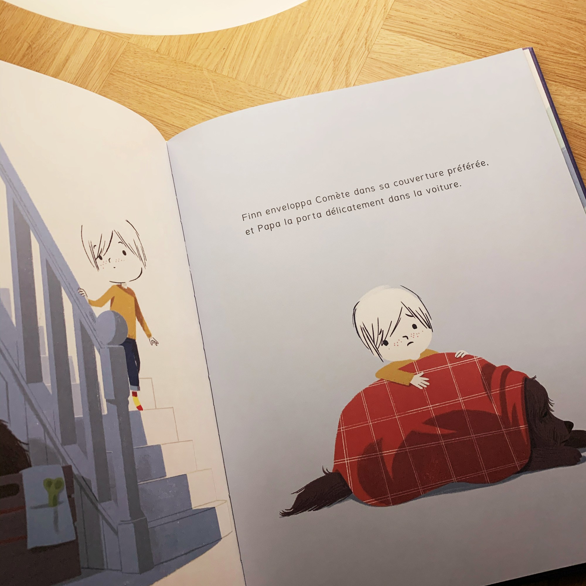 Alors quand Comète ne veut plus suivre Finn et reste couchée sur son coussin, c’est forcément qu’elle ne va pas bien et qu’il faut l’emmener chez le vétérinaire. Alors qu’il pensait rentrer avec elle après son contrôle, c’est dur pour le petit garçon de la laisser seule là-bas toute seule et de n’avoir que la possibilité d’espérer qu’elle en sorte bientôt. Alors il apprend l’attente et surtout l’espoir. L’espoir qu’il fait vivre de toutes ses forces en invoquant la lune et toutes les lumières qui permettent d’éclairer l’obscurité. Comme sa Comète.