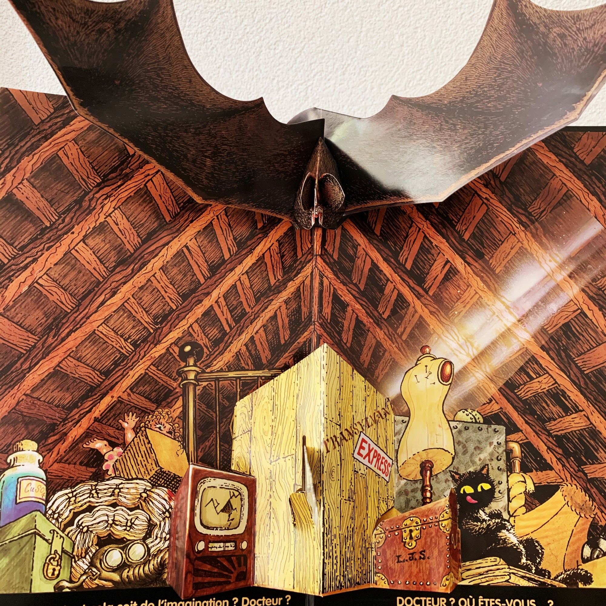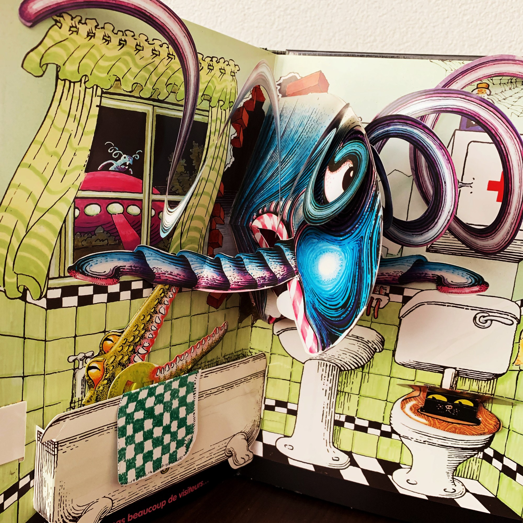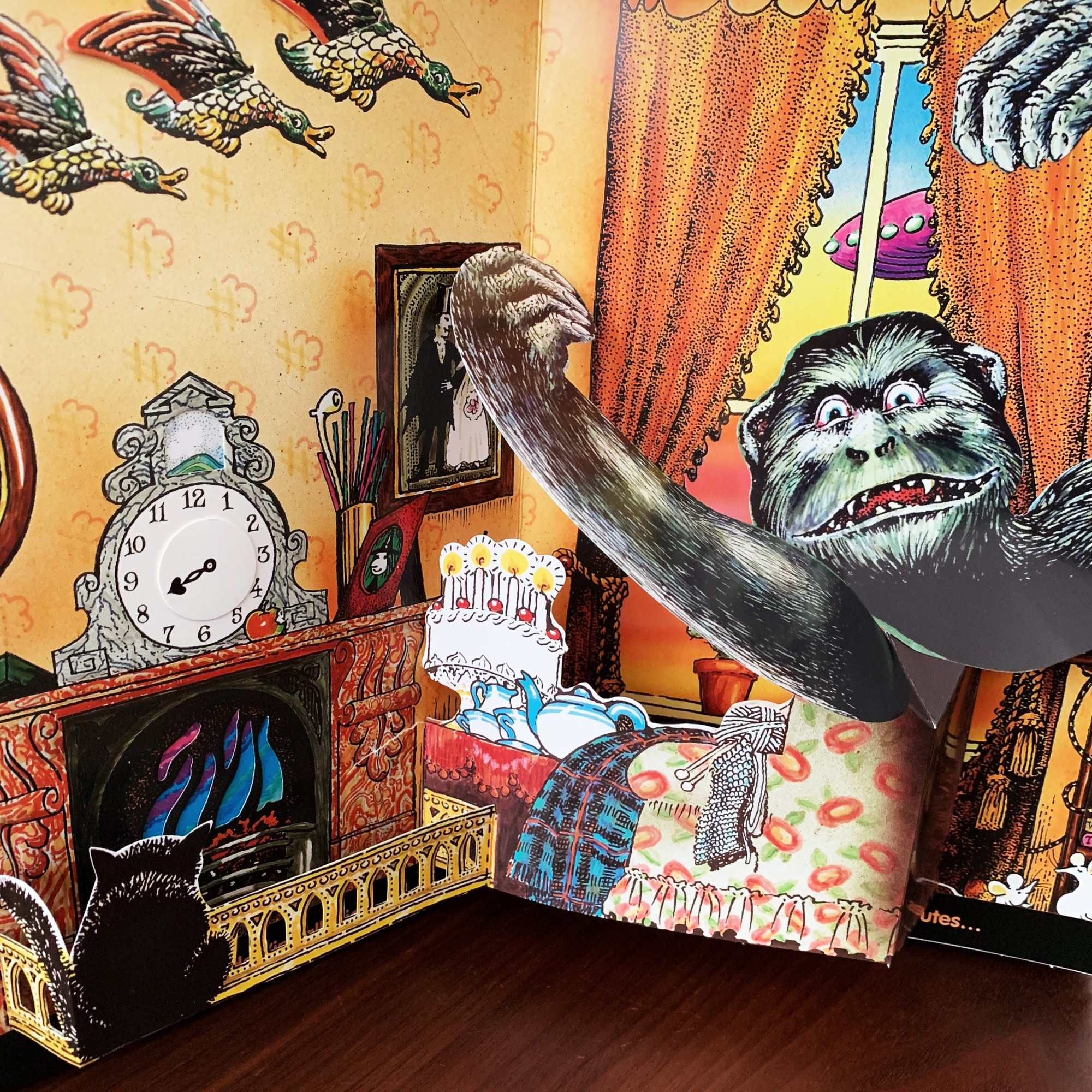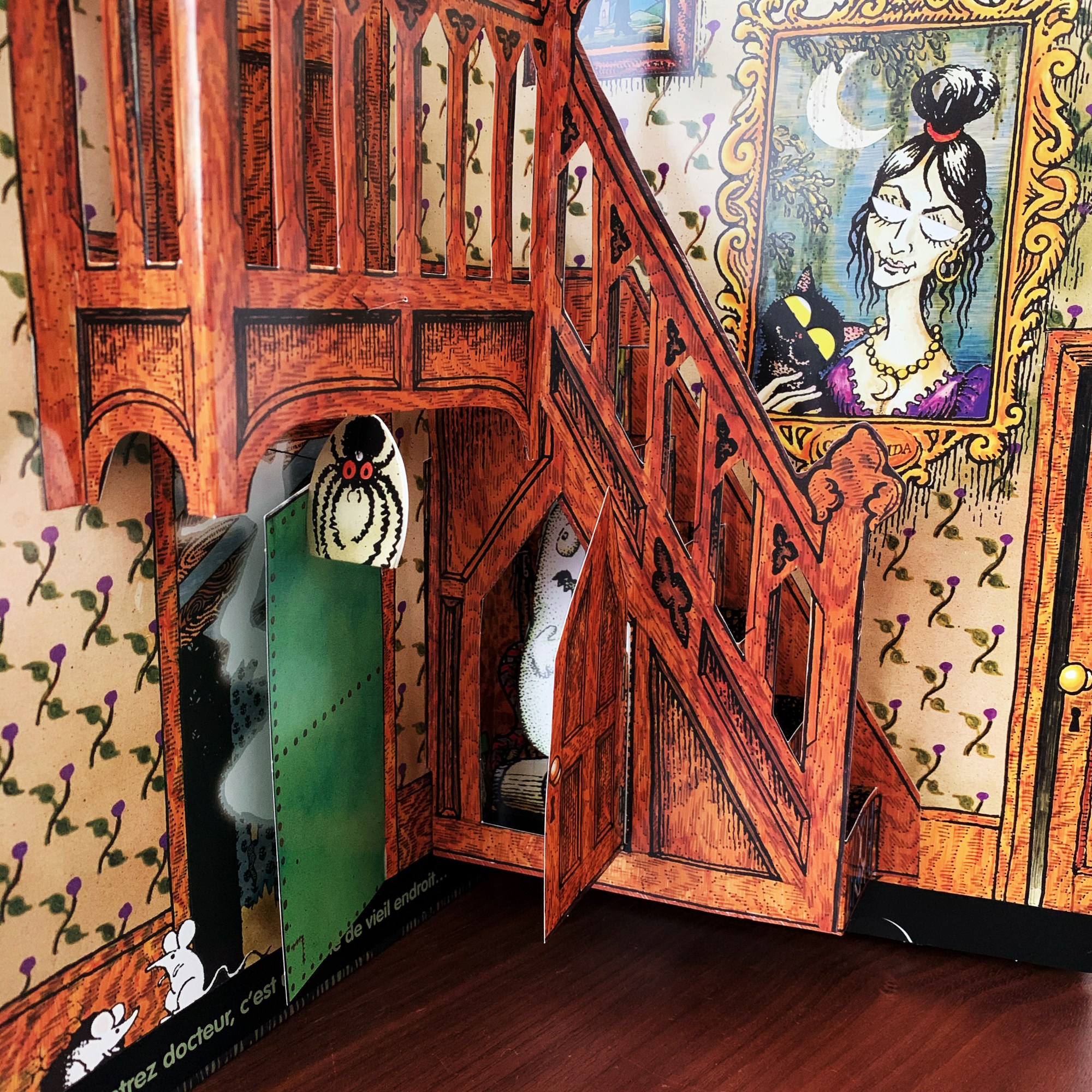 Malgré ses années, ce livre pop-up est toujours aussi efficace ! On pousse fébrilement la porte de cette maison pour parcourir chaque pièce à la façon d’un train fantôme, qui renferme son lot de surprises, de trappes et de fantômes. Tout y est subtilement présenté et chaque objet, chaque portrait ou bibelot joue son rôle à la perfection, nous sautant au visage ou se découvrant au détour d’un recoin sombre… On ne s’en lasse pas (et dieu sait si j’ai tourné ces pages, tiré ces languettes et soulevé ces innombrables volets).