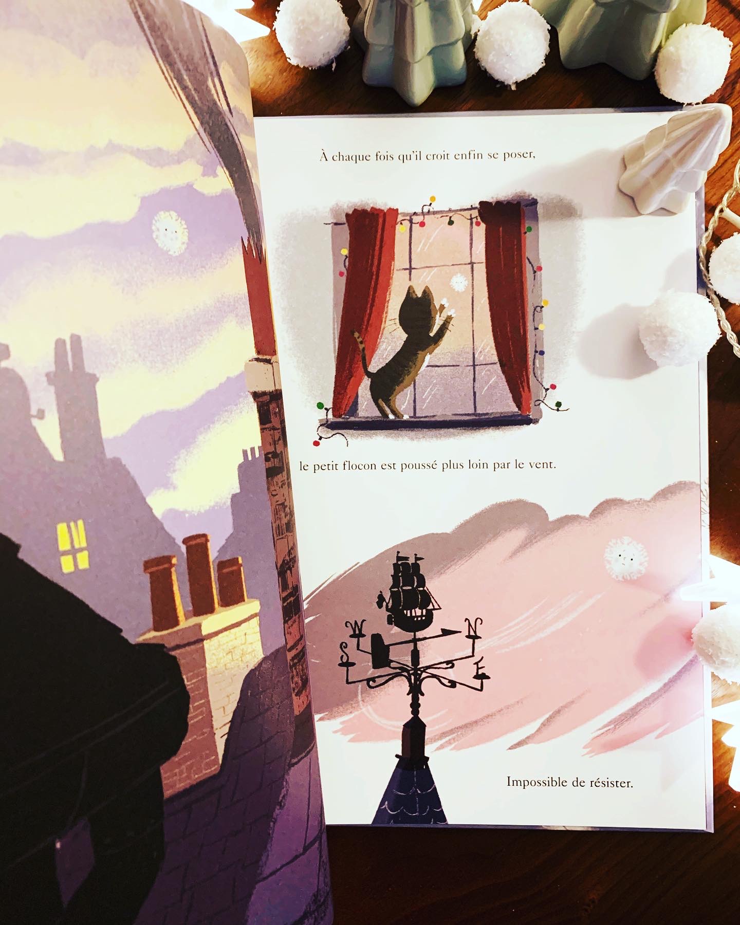 Quand un petit flocon se détache du ciel, il est très impressionné par toute cette immensité qui le fait voler dans tous les sens! Il se sent bien seul et aimerait bien se poser quelque part, pourquoi pas sur ce toit ou dans cette boutique où trône un sapin décoré?…