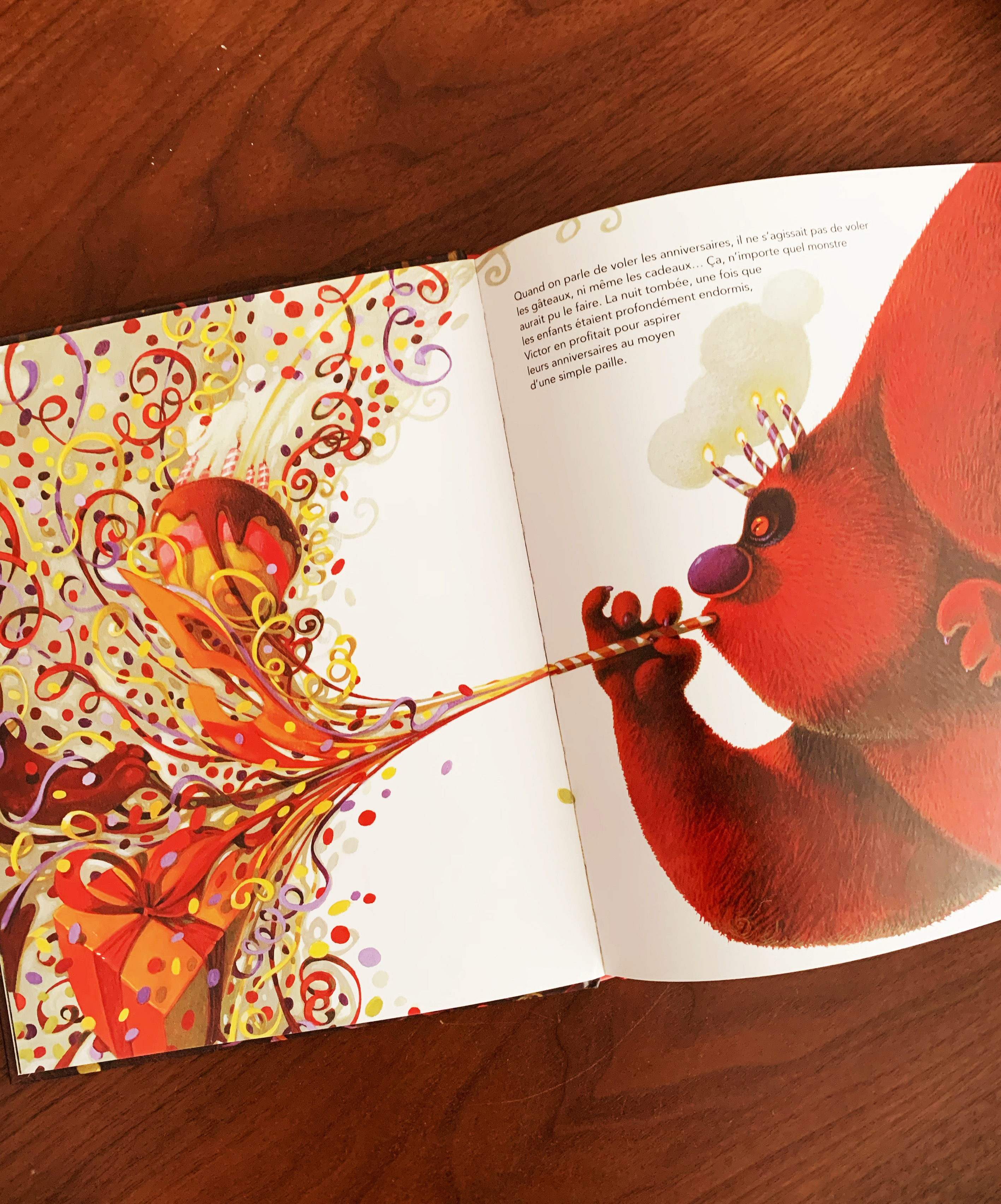 Victor n’est pas un monstre comme les autres …. d’abord il vit dans une grotte et il aime se parfumer d’eau de rose. Et puis il n’est pas vraiment méchant, lui ce qu’il aime c’est voler les anniversaires des enfants en les aspirant avec une paille. Pas très sympa mais il faut que vous sachiez que Victor a été élevé par des parents monstres vraiment méchants qui n’ont jamais pensé à lui fêter son anniversaire.