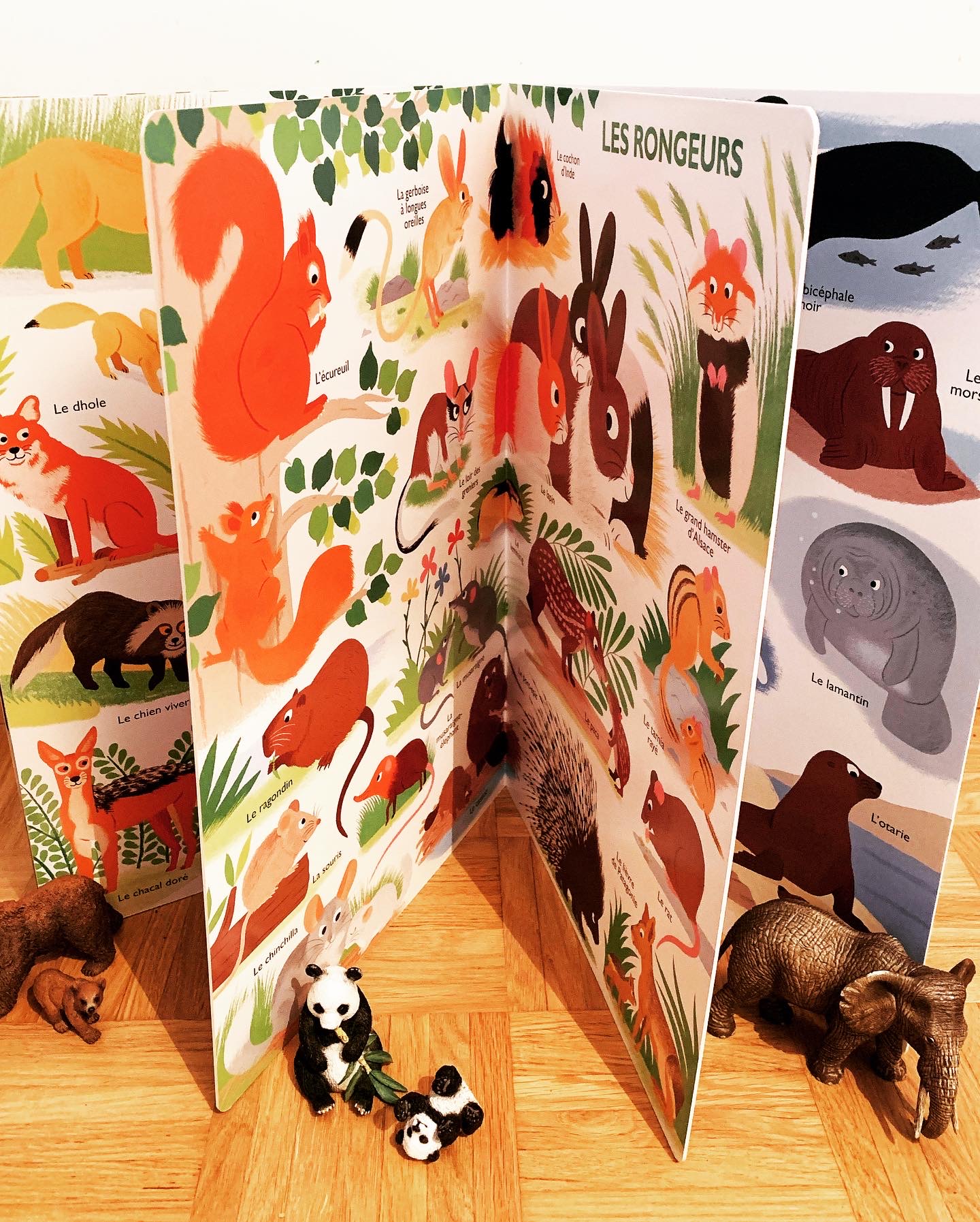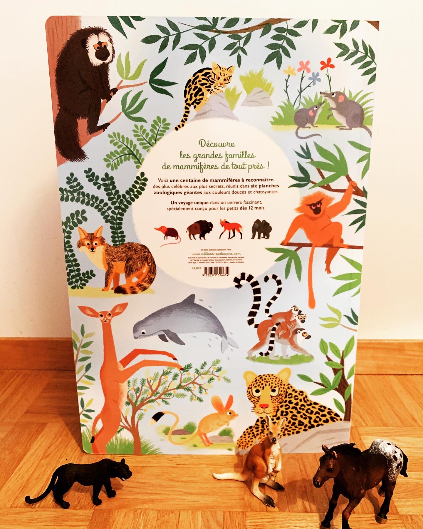 Ici ce sont les mammifères qui sont mis à l’honneur dans six planches géantes classées par famille, des bovidés aux félins en passant par les rongeur ou les cétacés. Les dessins des animaux sont particulièrement grands et leurs couleurs vives sont parfaites pour attirer les petits yeux et leur apprendre à reconnaître des centaines d’animaux.