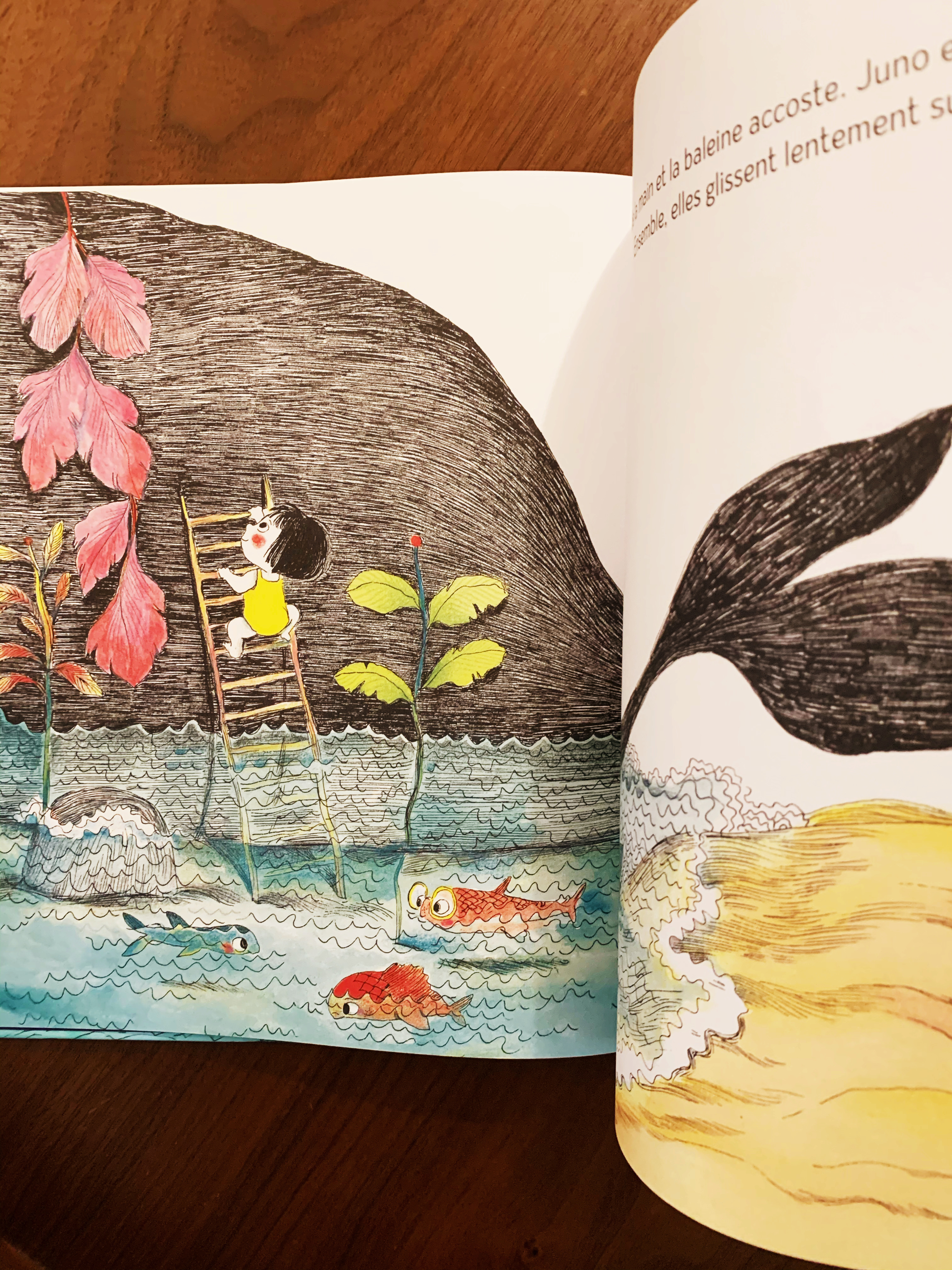 Une jolie baleine à lunettes qui transporte la petite Juno et son grand-frère Majé d’une rive à l’autre, au gré de leurs envie, durant 9 mois… 9 mois qui vont les conduire vers une jolie surprise et nous offrir une fin d’histoire surprenante et permettant plusieurs degrés de lecture, en faisant un livre tendre et idéal pour l’histoire du soir.