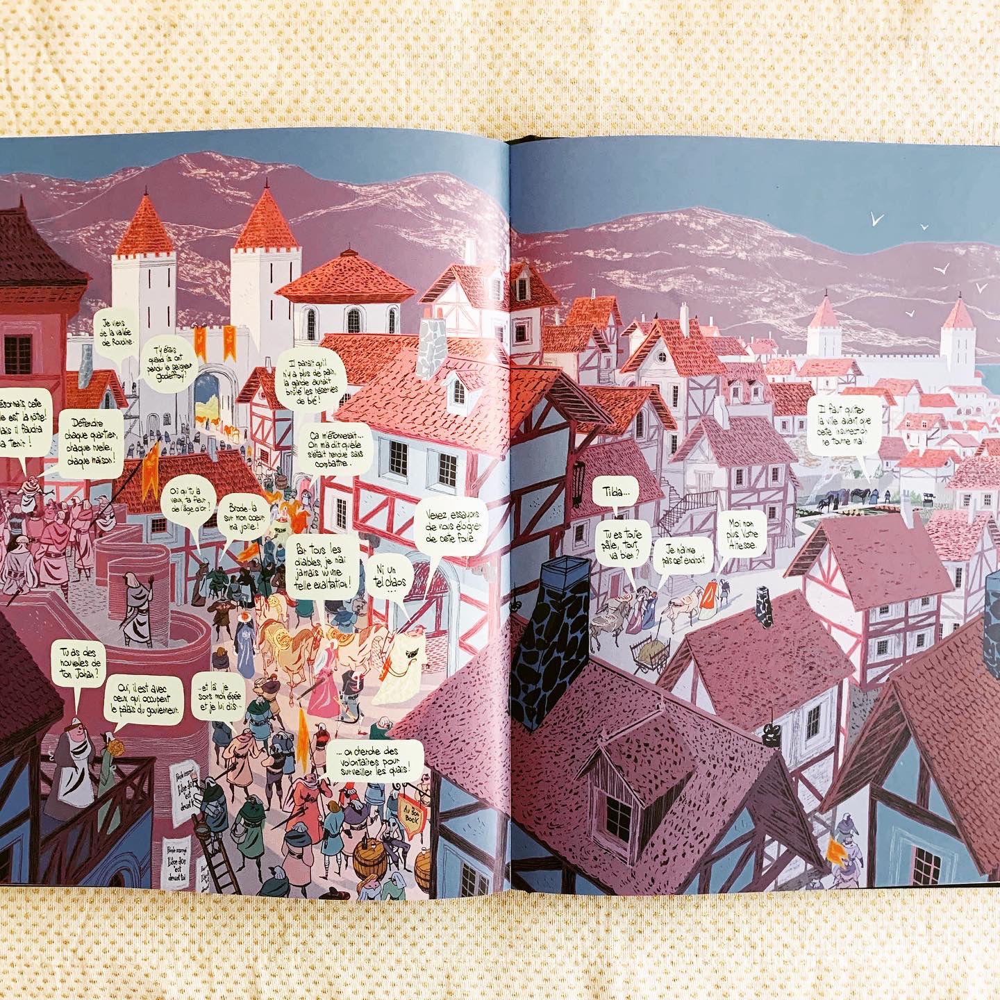 Quelle beauté! Quel incroyable travail que ces illustrations aux mille détails, aux teintes si recherchées qui nous transcendent… je peux imaginer que ces dessins assez particuliers peuvent ne pas plaire à tout le monde mais moi je suis tombée complètement sous leur charme. Les double planches panoramiques sont particulièrement somptueuses et nous invitent au voyage.
