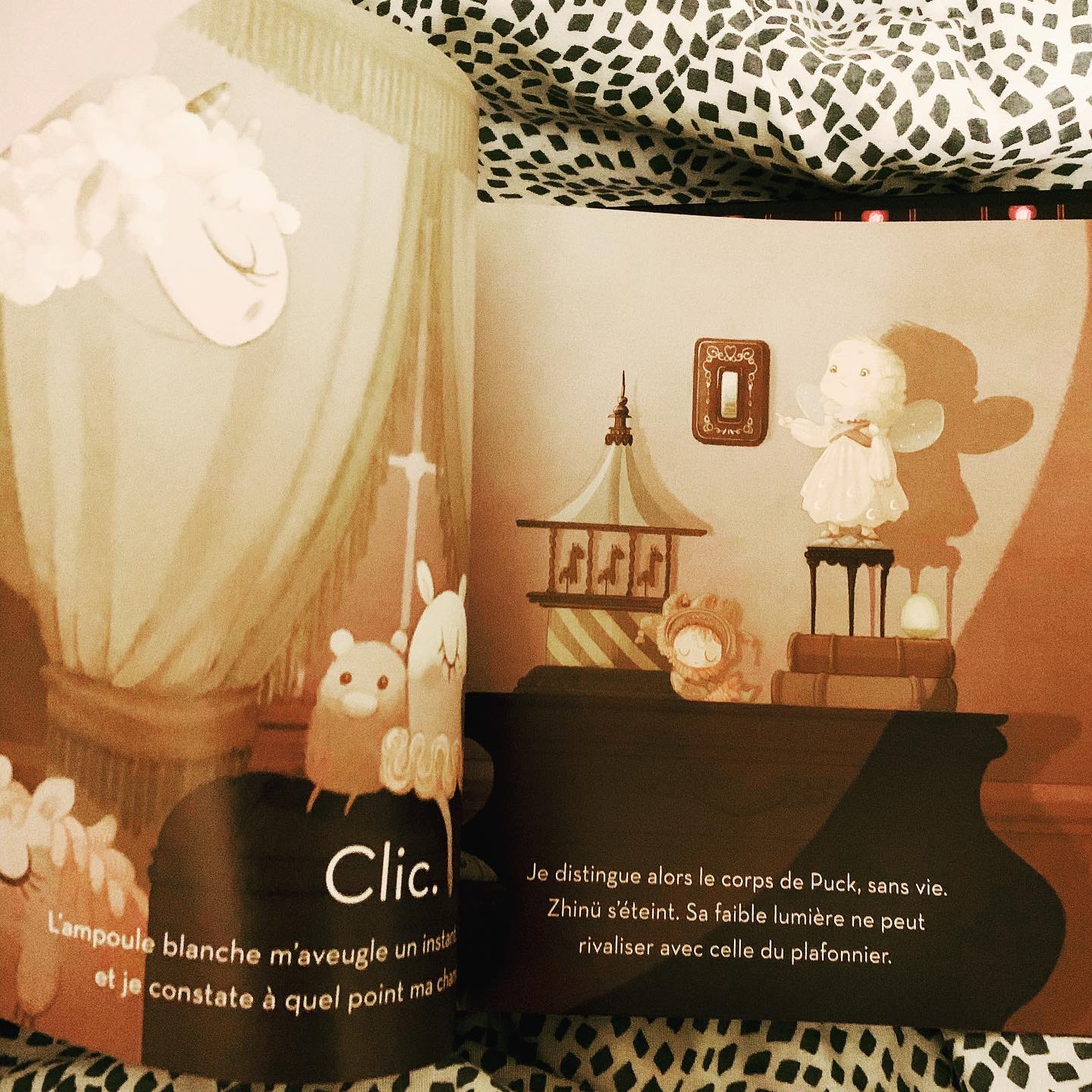 Ce que j’aime particulièrement dans l’histoire de Zhinü (le nom de la déesse chinoise d’une étoile) , c’est qu’elle fait la part belle au noir et aux ombres sans qui la lumière ne peut exister. Son histoire avec la nuit la petite fille nous la raconte avec sa voix et nous présente ses aides de nuit : Puck, son doudou fort et courageux, et Zhinü sa veilleuse magique qui illumine de mille feux monstres et croque-mitaines! C’est à leurs côté que notre petite fille se transforme en fée et part à l’assaut des ombres envahissantes!
