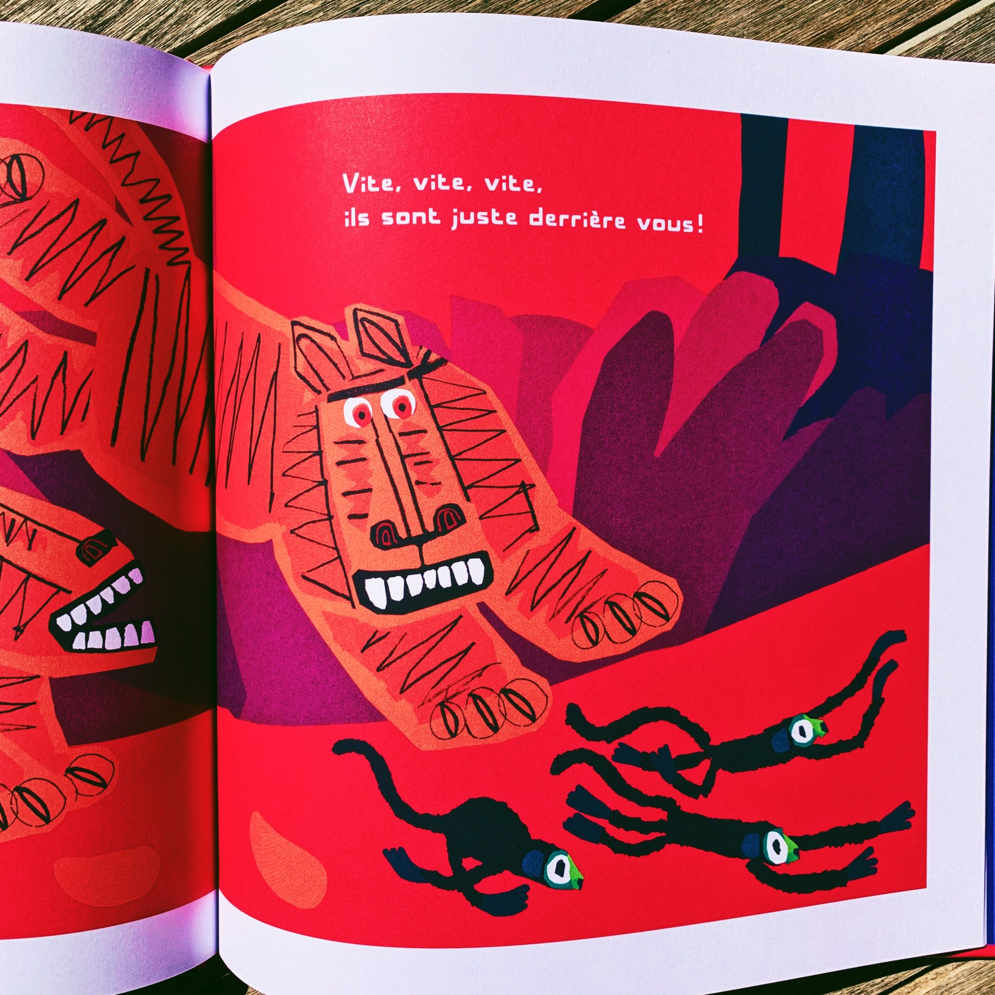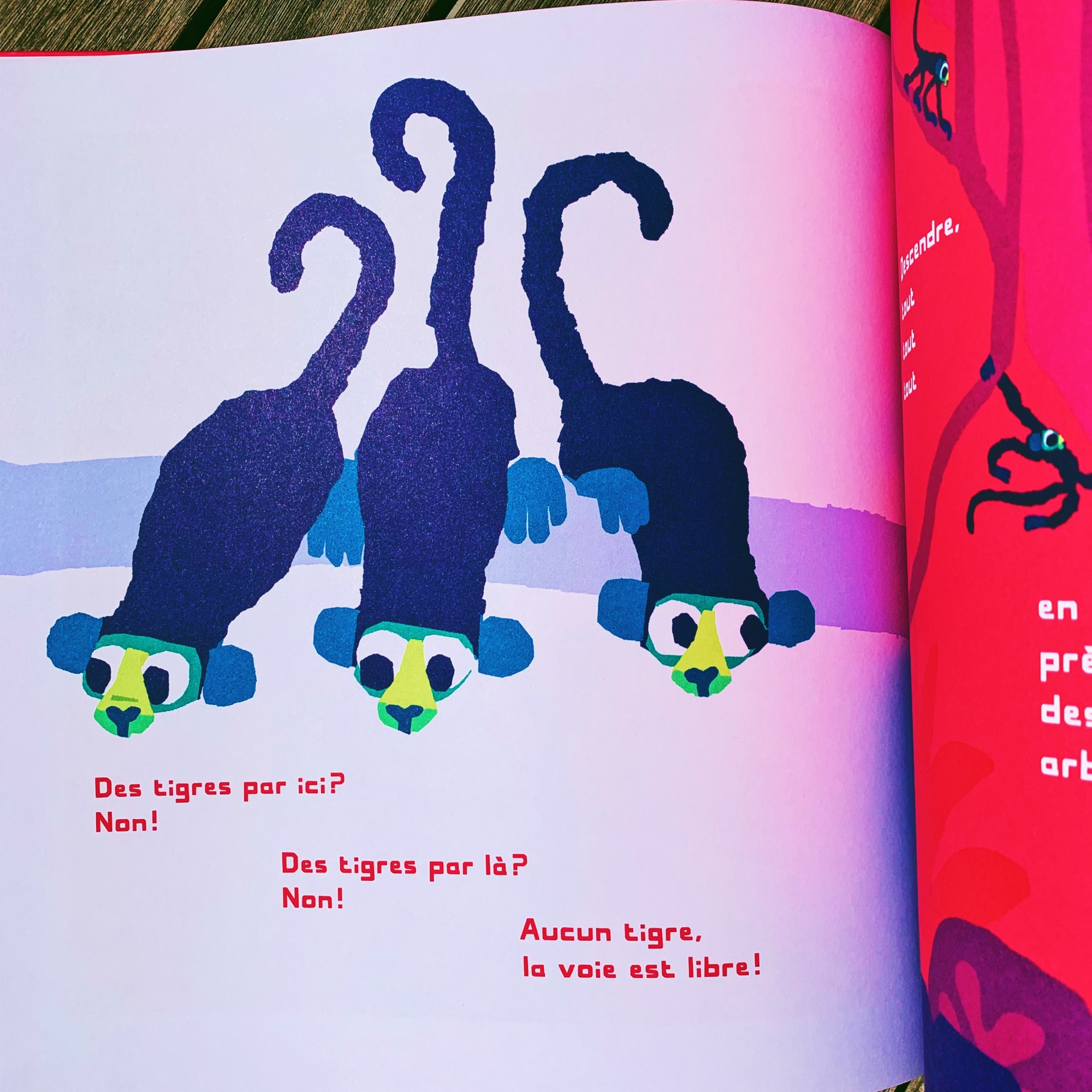 Ici on fait la rencontre de trois petit singes coquins (vite baptisés chez nous, vous pensez bien…) qui sont bien décidés à braver le danger malgré les recommandations de leur mère. Et si…. tout était sujet à interprétation finalement ?