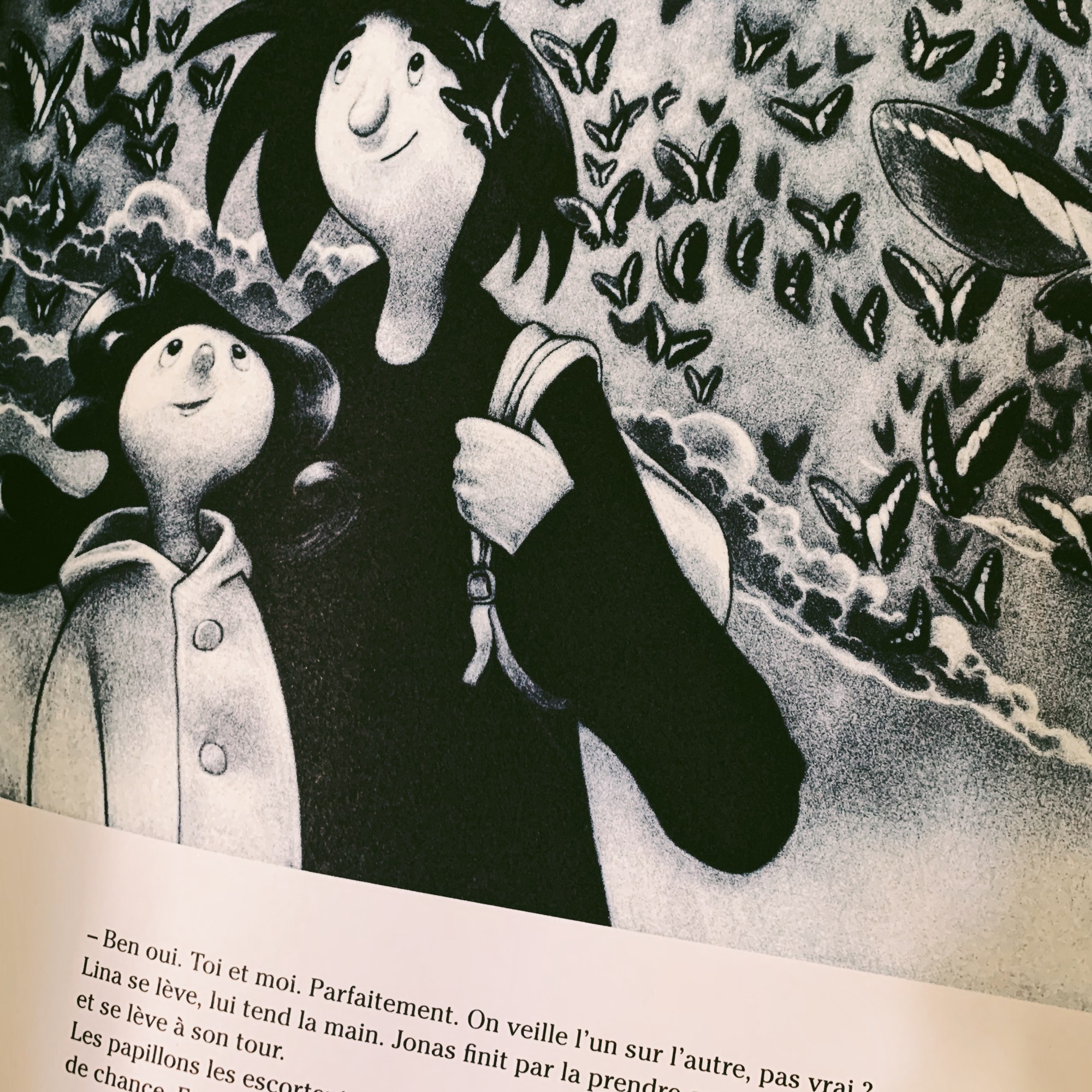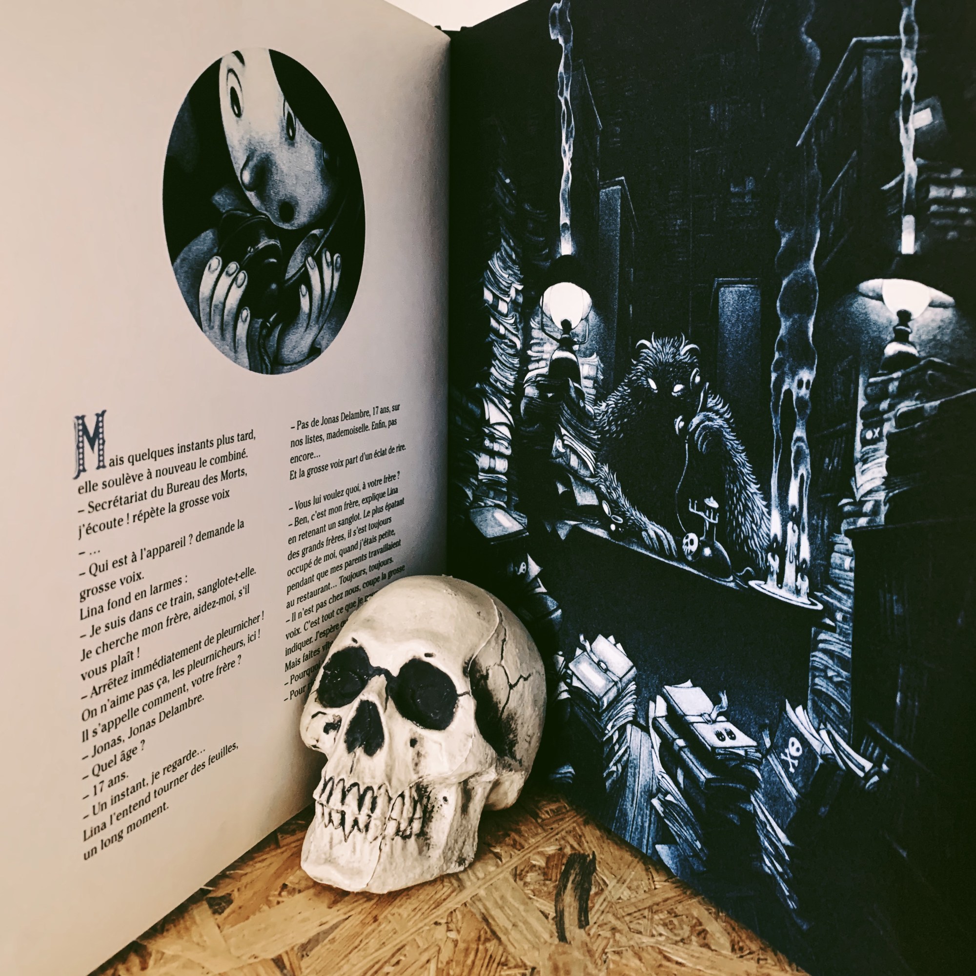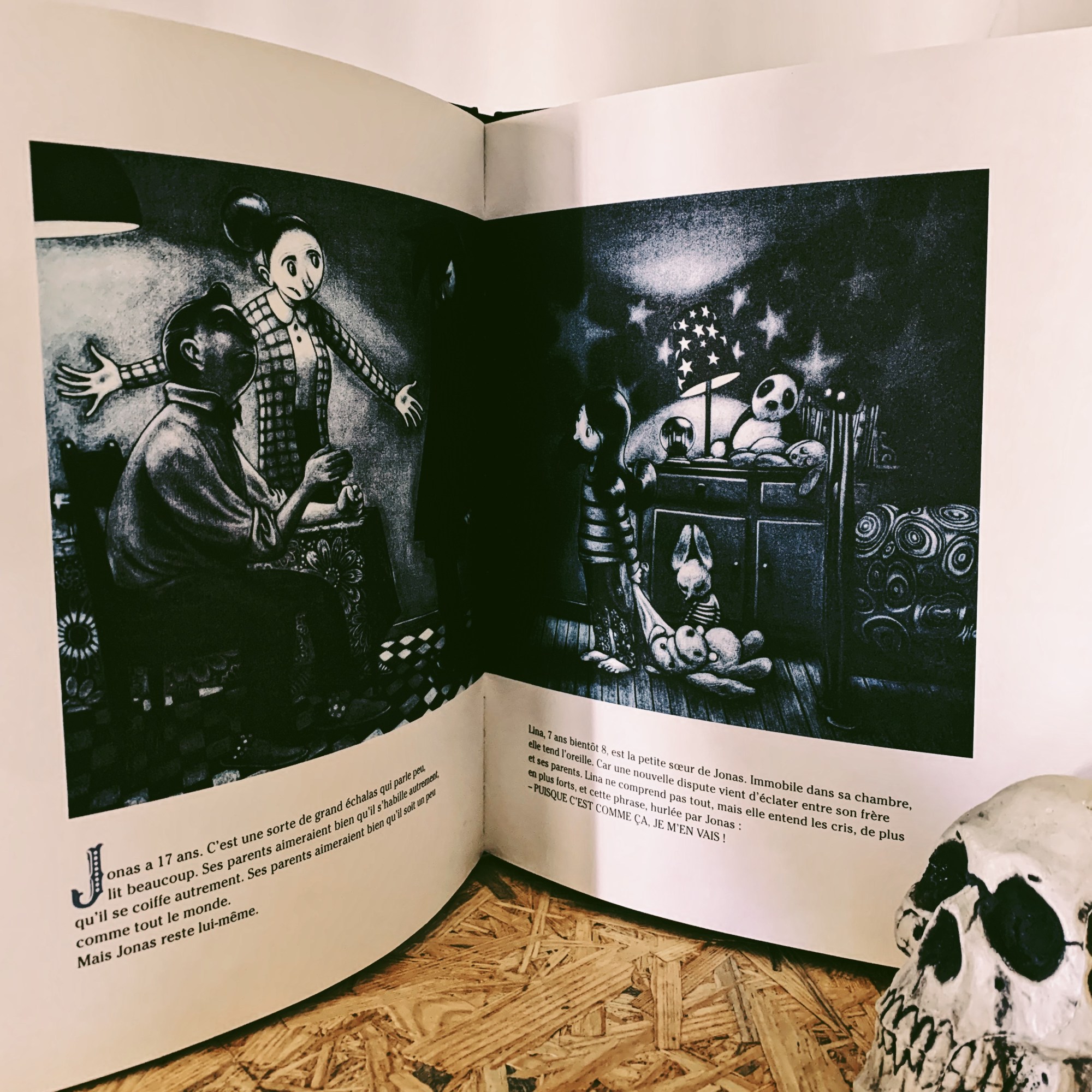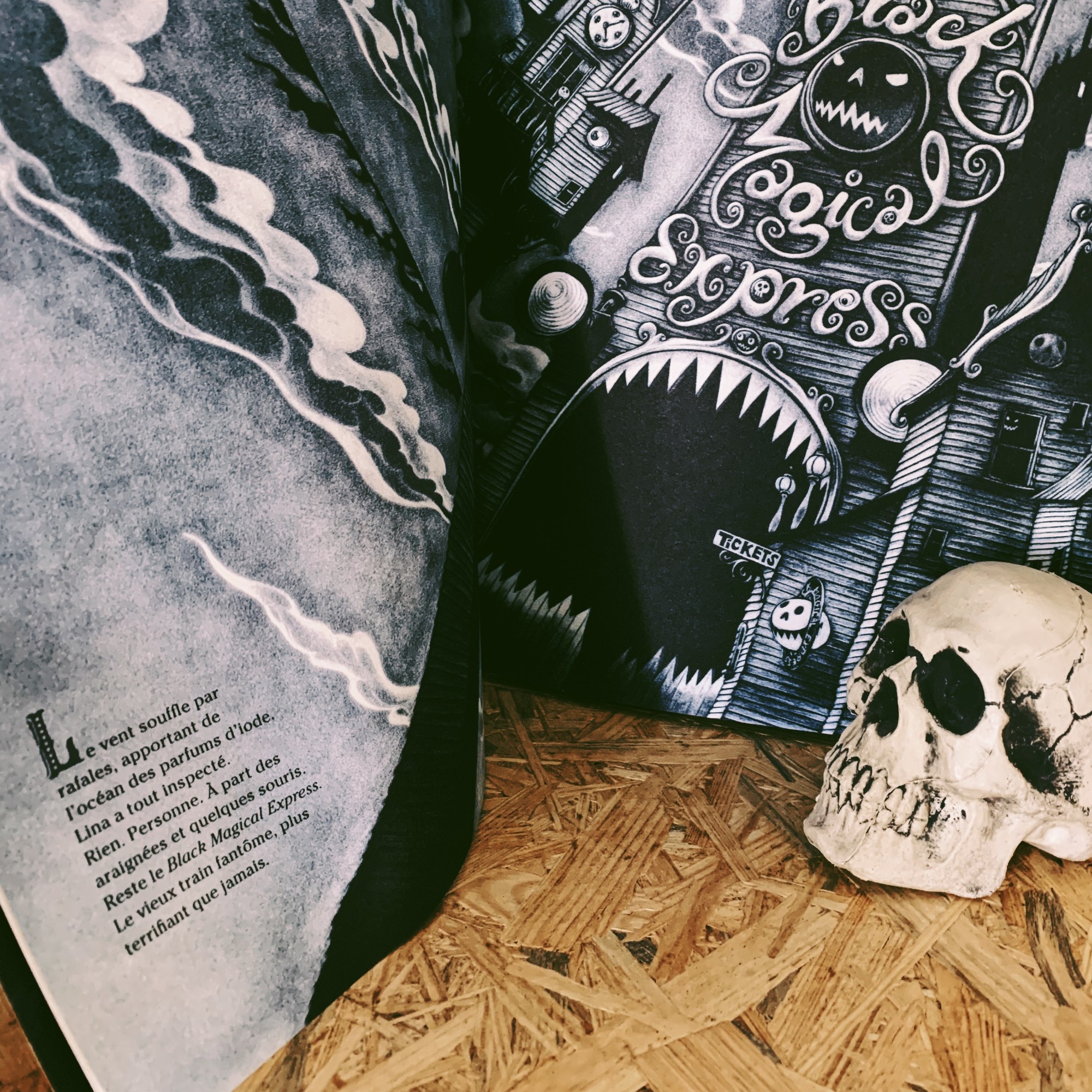 A son échelle, ce sont les sublimes illustrations en noir et blanc qui lui donnaient des frissons. Les squelettes, les monstres et le manège du train fantôme sur lequel on grimpe avec des frissons qui donnent envie. A la mienne c’est le fond de l’histoire qui m’a fait froid dans le dos et m’a laissé des frissons pendant un peu trop longtemps.