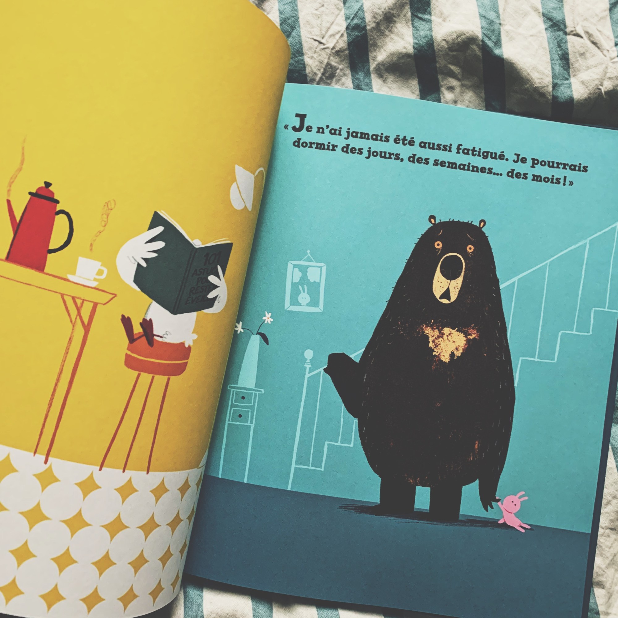 Ours est fatigué. Trèèès fatigué. Il pourrait dormir des semaines entières. Canard, lui, est spécialement en forme et il s’ennuie. Que peut bien faire Ours ? Il veut dormir ? Quelle idée …. et Canard est bien décidé à faire des trucs même si Ours ne l’entend pas de cette oreille!