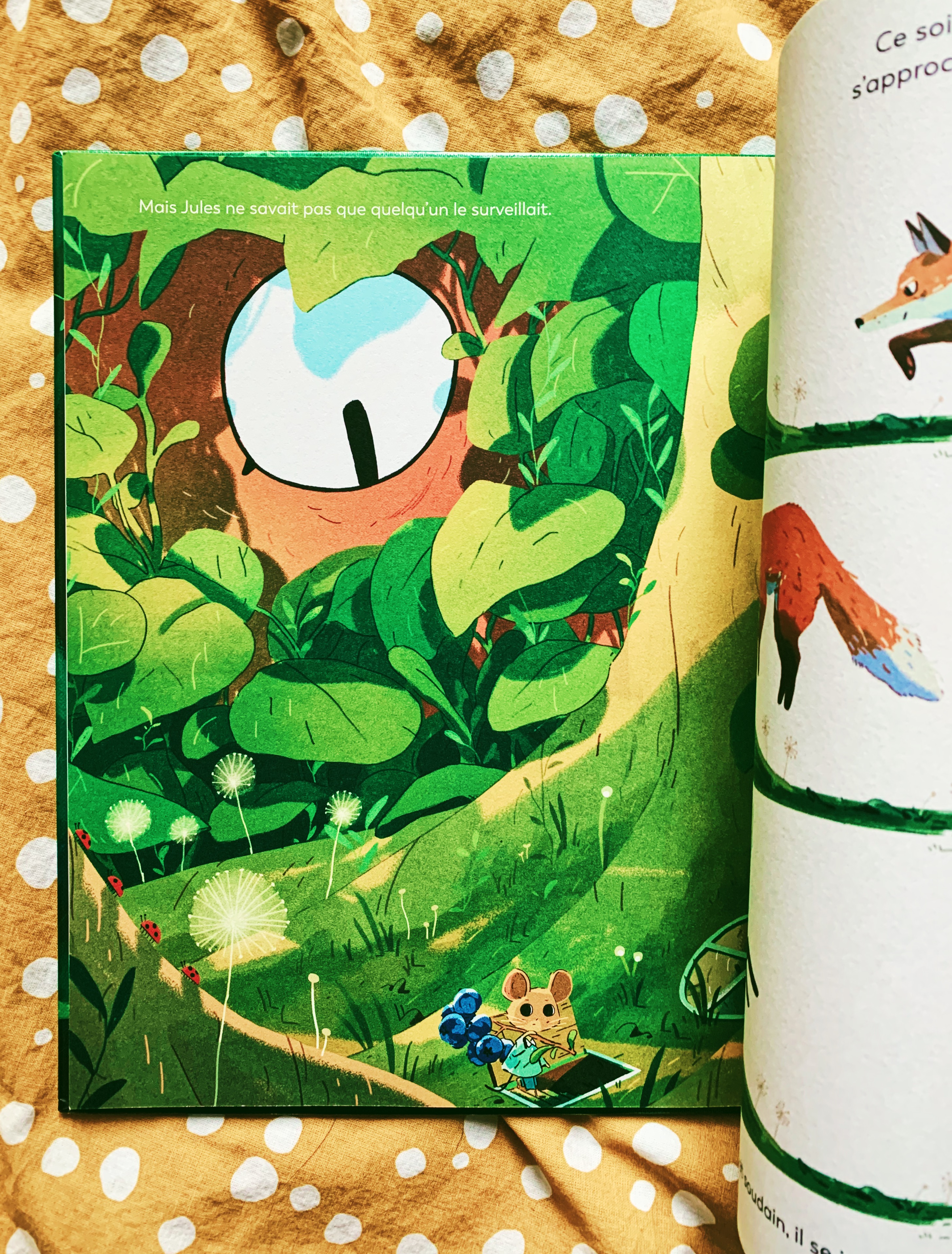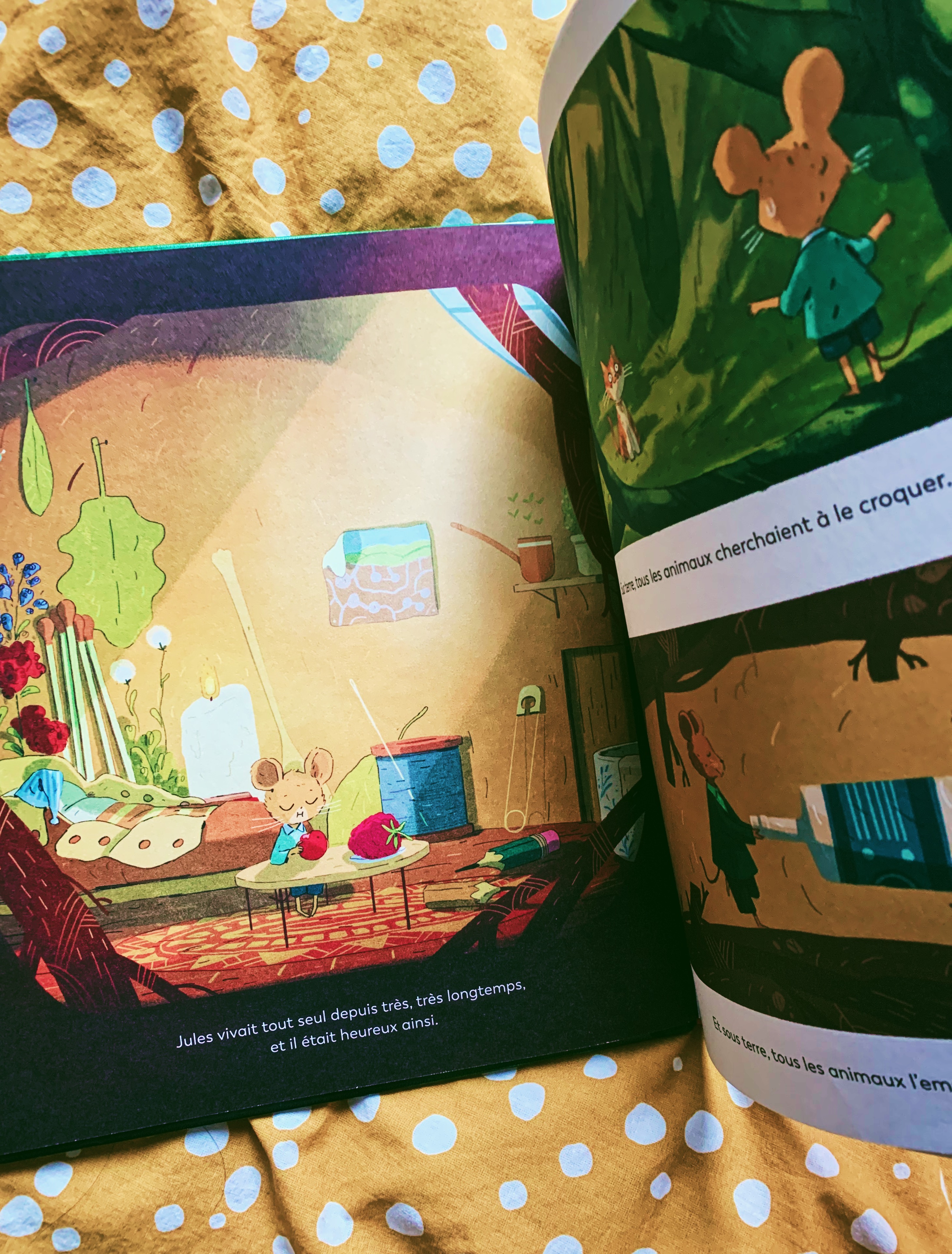 Et puis on l’a ouvert … et quelle bonne surprise ! quel joli coup de cœur ! On rencontre le petit Jules, un souriceau qui mène sa petite vie pépère dans son terrier, suivant les jours et les habitudes, qui se trouve toujours mieux seul que (mal) accompagné. Jusqu’au jour où il se fait courser par un renard affamé qui va finir le museau… dans la terre! Il va bien falloir faire avec ce museau au plein milieu du salon de Jules… Et alors le petit souriceau va découvrir que finalement certaines compagnies peuvent être moins désagréables que d’autres et même parfois sacrément utiles!