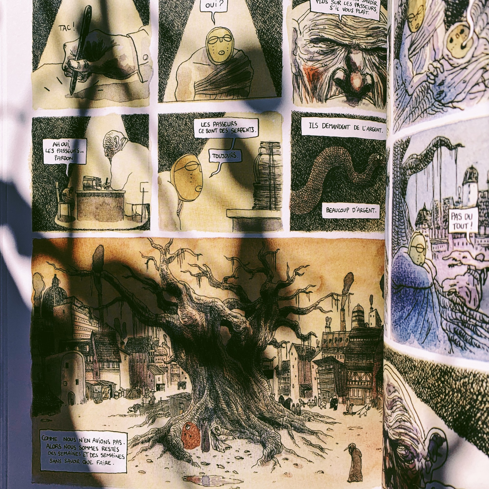 Les illustrations aux teintes changeantes sont parfois troublantes, parfois effrayantes, mais nous embarquent dès les premières cases dans un monde étrange et hypnotique.