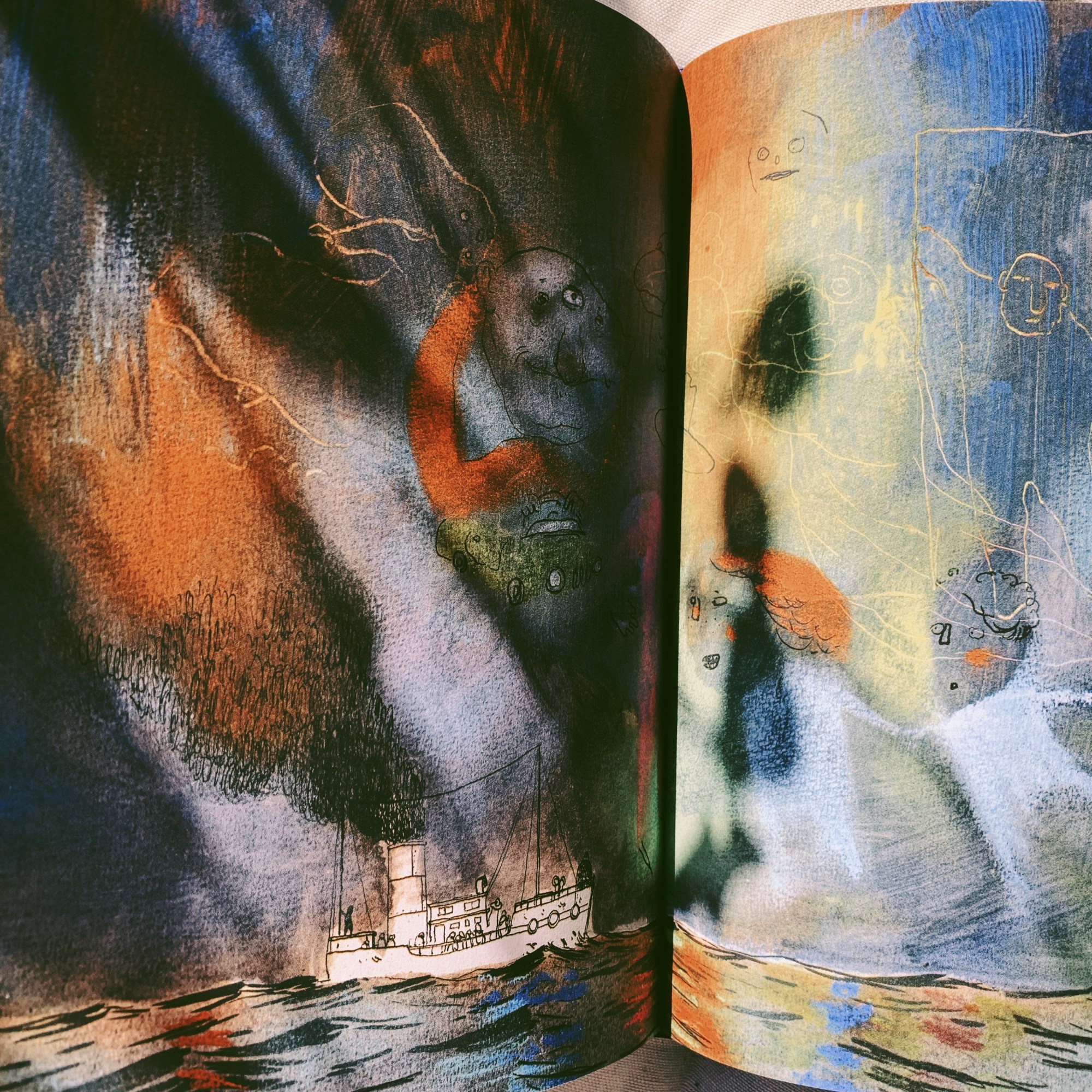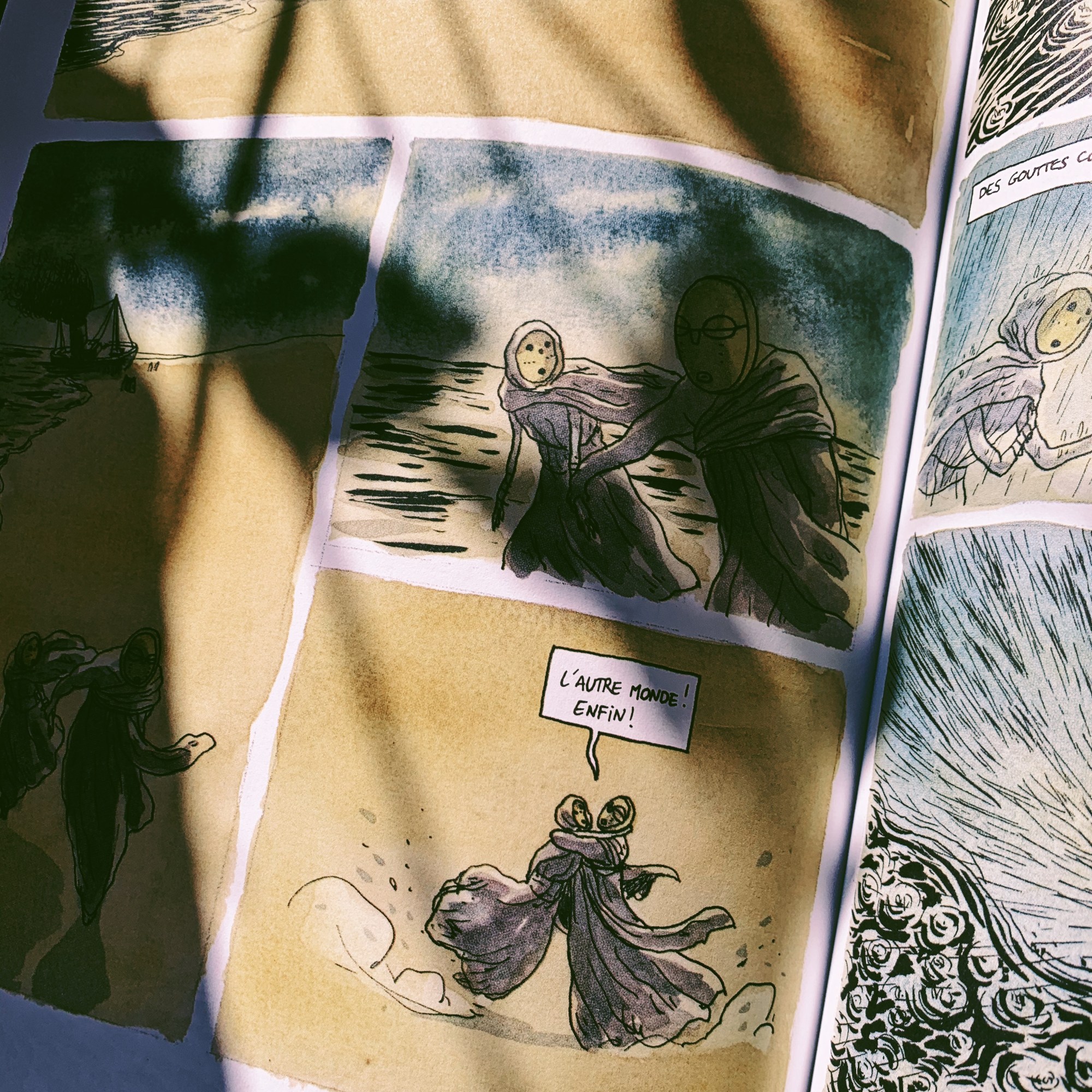 Quelle beauté, cet album mystérieux qui nous parle de façon métaphorique des problématiques de l’exil et de l’immigration. Les personnages n’ont jamais de visage, le sujet étant trop universel, les masques qu’ils portent pouvant identifier chaque homme et chaque femme qui s’est trouvé un jour à cette place. Pièce de théâtre à l’origine, Les Ombres laisse peu de place à la cause ou à une quelconque solution. Seule compte la problématique de l’exil, désespéré, jonché d’obstacles infranchissables, comme un chemin de croix qui ne laisse pas de place à un choix quelconque. Survivre. Continuer.