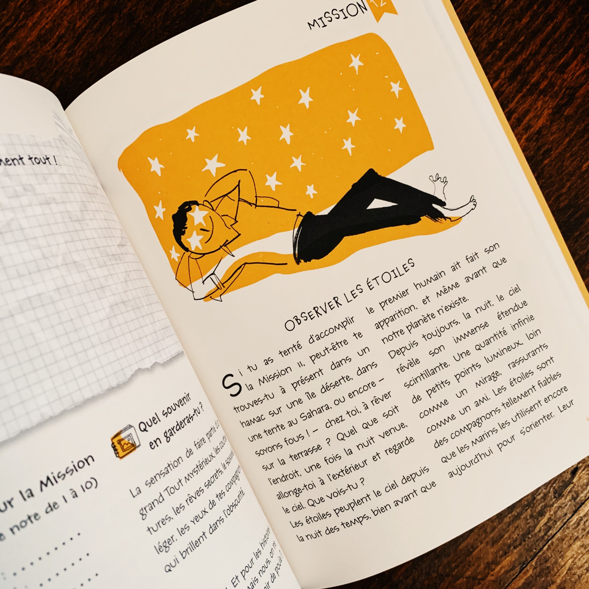 Présenté comme un journal intime ou un guide pour toutes les graines d’aventurier, cet album aux faux airs de Manuel des Castors Juniors rien qu’à soi (on peut y inscrire son nom et faire plein d’annotations) propose aux kids 50 missions à accomplir avant ses 13 ans (avant d’être grand quoi!).
