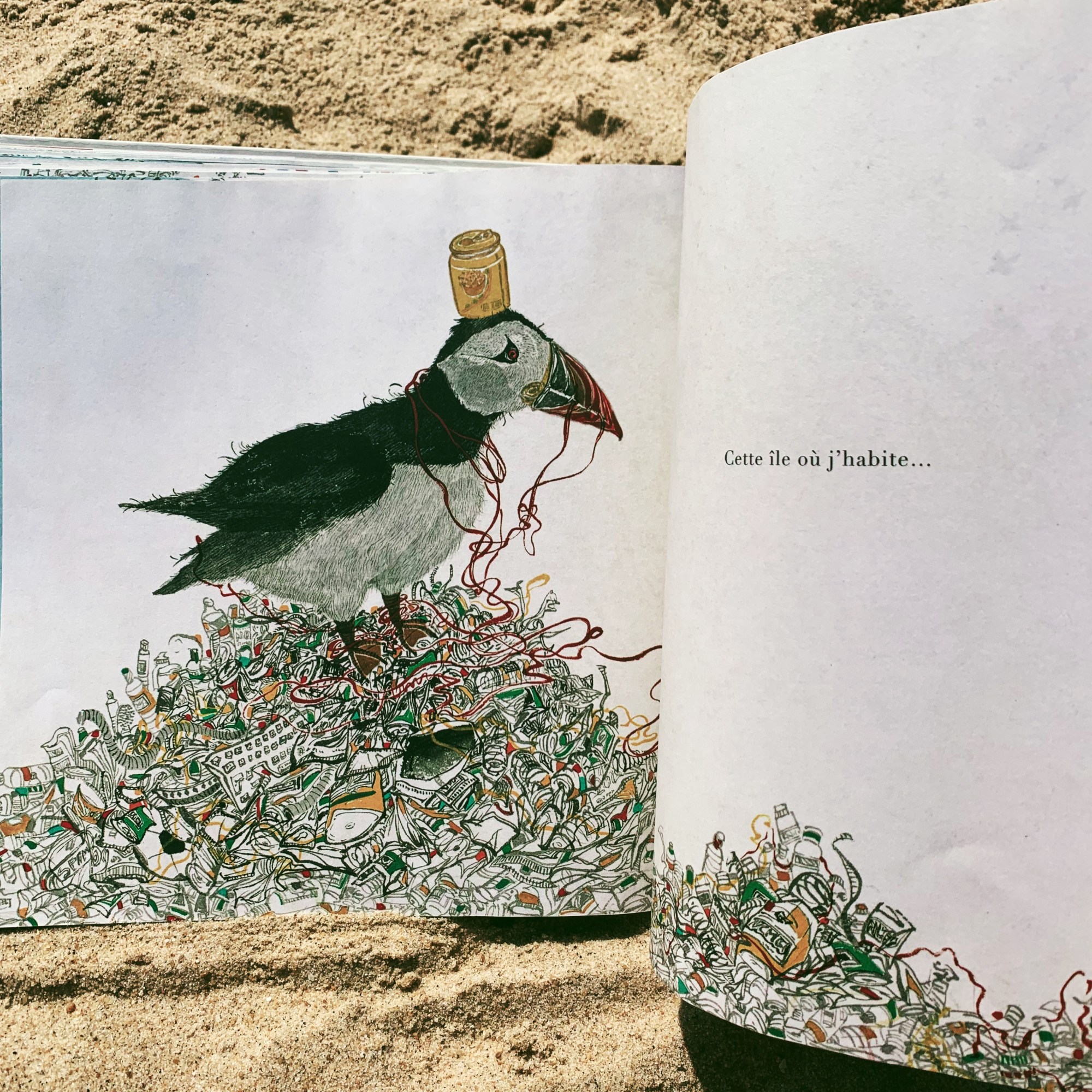 Le petit Macareux moine qui nous raconte cette histoire nous invite à visiter son île. Celle qui s’est construite au fil du temps et flotte au milieu de la mer. Elle accueille de nombreuses espèces animales qui peu à peu s’adaptent à cet environnement nouveau et bizarre et parfois certains hommes s’y rendent et essaient de la nettoyer, de la réduire à défaut de la faire disparaître. Mais elle enfle à nouveau, inlassablement, sans cesse.