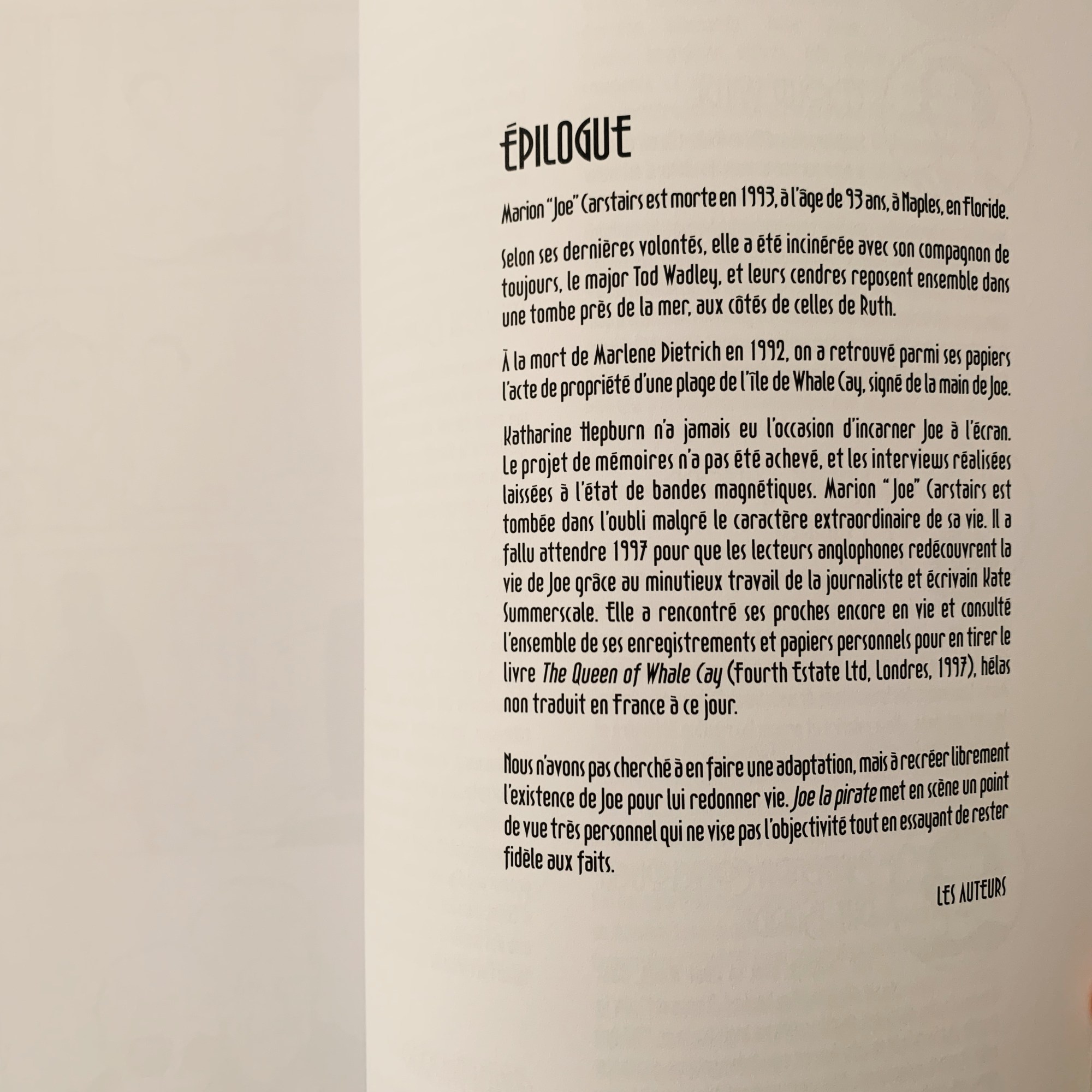 Joe la Pirate, c’est une certaine vision de la vie de cette riche héritière passionnée de vitesse presque autant que de liberté qui est proposée. Les auteurs ne revendiquent pas une totale objectivité à cette adaptation mais le parti pris de recréer un destin en demeurant au plus près des faits.