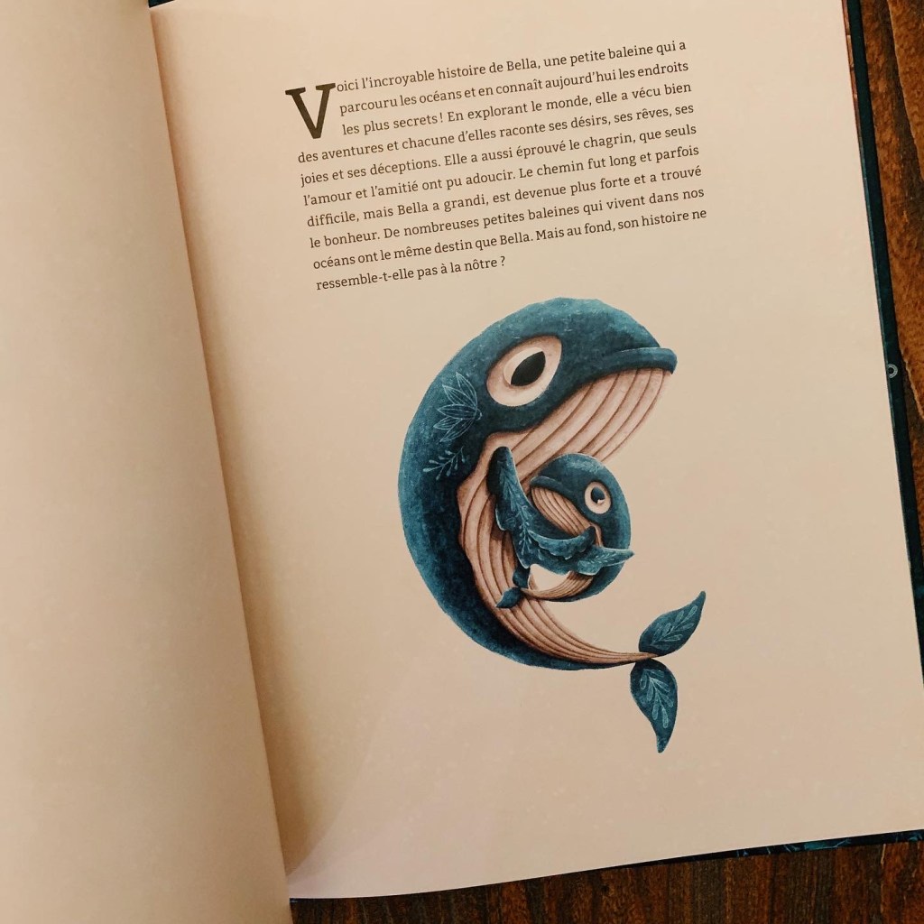 On suit l’histoire de notre petite baleine, Bella, qui se retrouve un matin séparée de sa maman, de sa famille si soudée qu’elle aime tant et dont le credo était justement de ne jamais se quitter. La quête de sa vie commence : retrouver les siens. Elle traversera des océans bienveillants, parfois moins, accueillants et glacials, portée par son courage et l’espoir qu’elle garde précieusement au fond d’elle, guidée par les souvenirs des conseils précieux de sa maman.