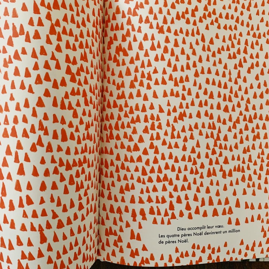 On remonte le temps dans cette histoire pour revenir au commencement. Quand il y avait si peu d’enfants sur la terre qu’un seul Père-Noël accomplissait facilement sa tournée durant la nuit de Noël. Mais peu à peu la tâche est devenue impossible pour lui. Il demanda donc de se dédoubler. Cela fonctionna quelque temps…puis à nouveau les deux Pères-Noël furent débordés! Le nombre de petits bonhommes rouge augmenta donc en fonction des besoins, mais le souci c’est qu’ils rapetissent de taille au même rythme! Pas facile de soulever de gros nounours quand on fait la taille d’une fourmi. Tous les Pères-Noël eurent alors une idée… la meilleure de toutes.