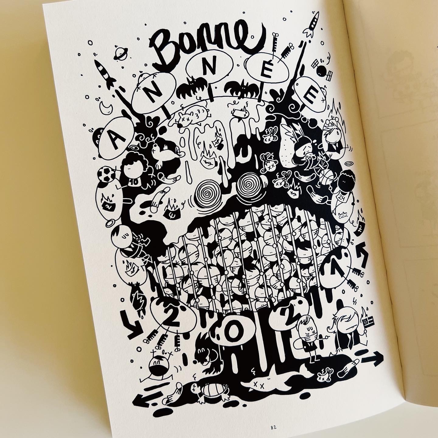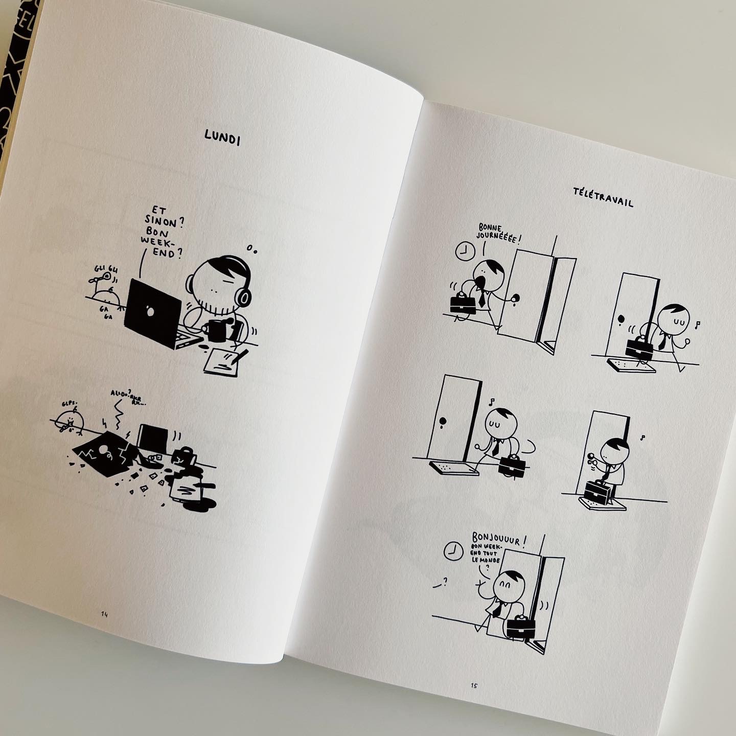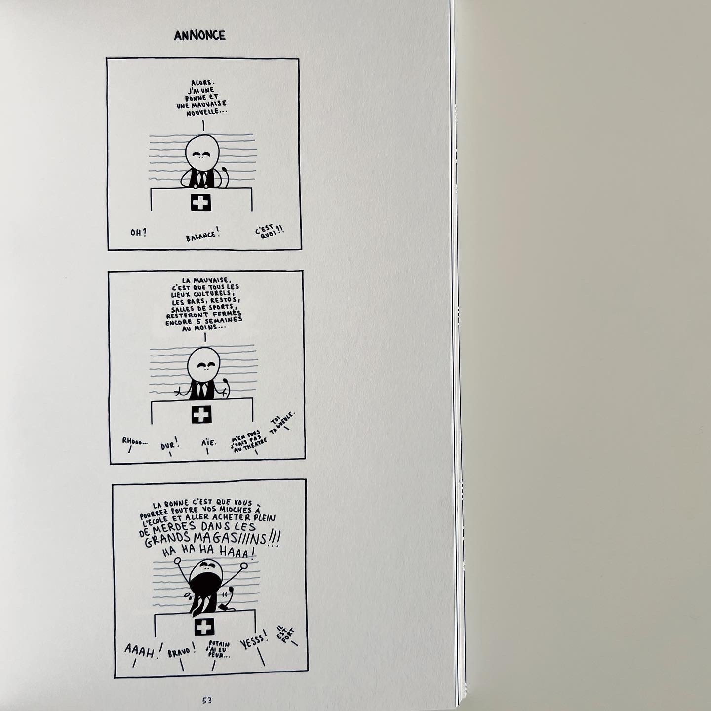 Si vous suivez le compte de l’illustrateur genevois, les planches présentées dans cette BD au format très agréable ne vous seront pas inconnues. Il regroupe ici, chronologiquement, les blagues en noir et blanc (très marrantes) qu’il publie régulièrement depuis l’arrivée de notre ami Covid, selon son humeur et l’actualité du moment. Et il faut dire qu’il y en a, des choses à dire.