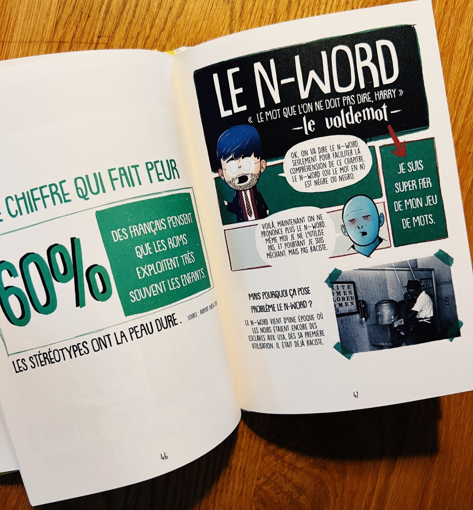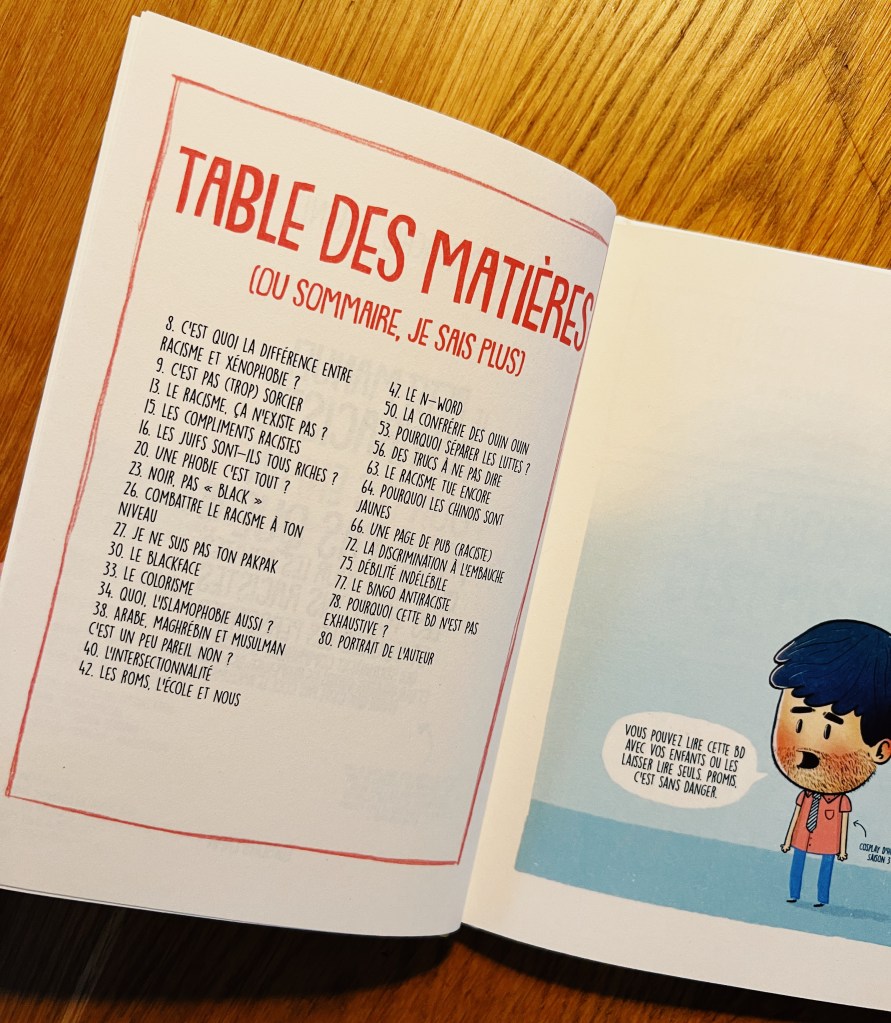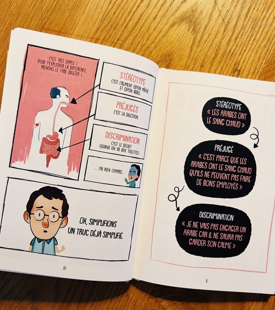 Lโauteur et illustrateur franรงais nous propose ici un petit tour dโhorizon (non exhaustif pour un sujet si vaste il est clair lร -dessus) sur diffรฉrents aspects du racisme exposรฉs avec des mots simples et clairs. Il รฉclaire le regard sur les termes de racisme, xรฉnophobie, stรฉrรฉotype, prรฉjugรฉ, discrimination histoire de sโy retrouve un peu et dโappeler un chat un chat. Il explique la diffรฉrence entre les notions de religion et de race, ce quโest lโintersectionnalitรฉ, le N-word, le blackface, lโattitude ร avoir pour รฉviter de dire nโimporte quoi sans le vouloirโฆ โ