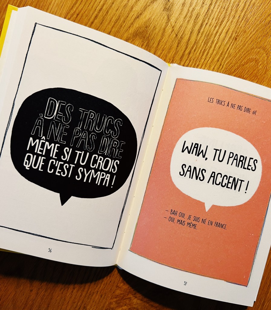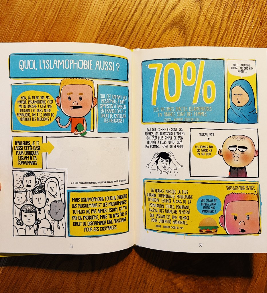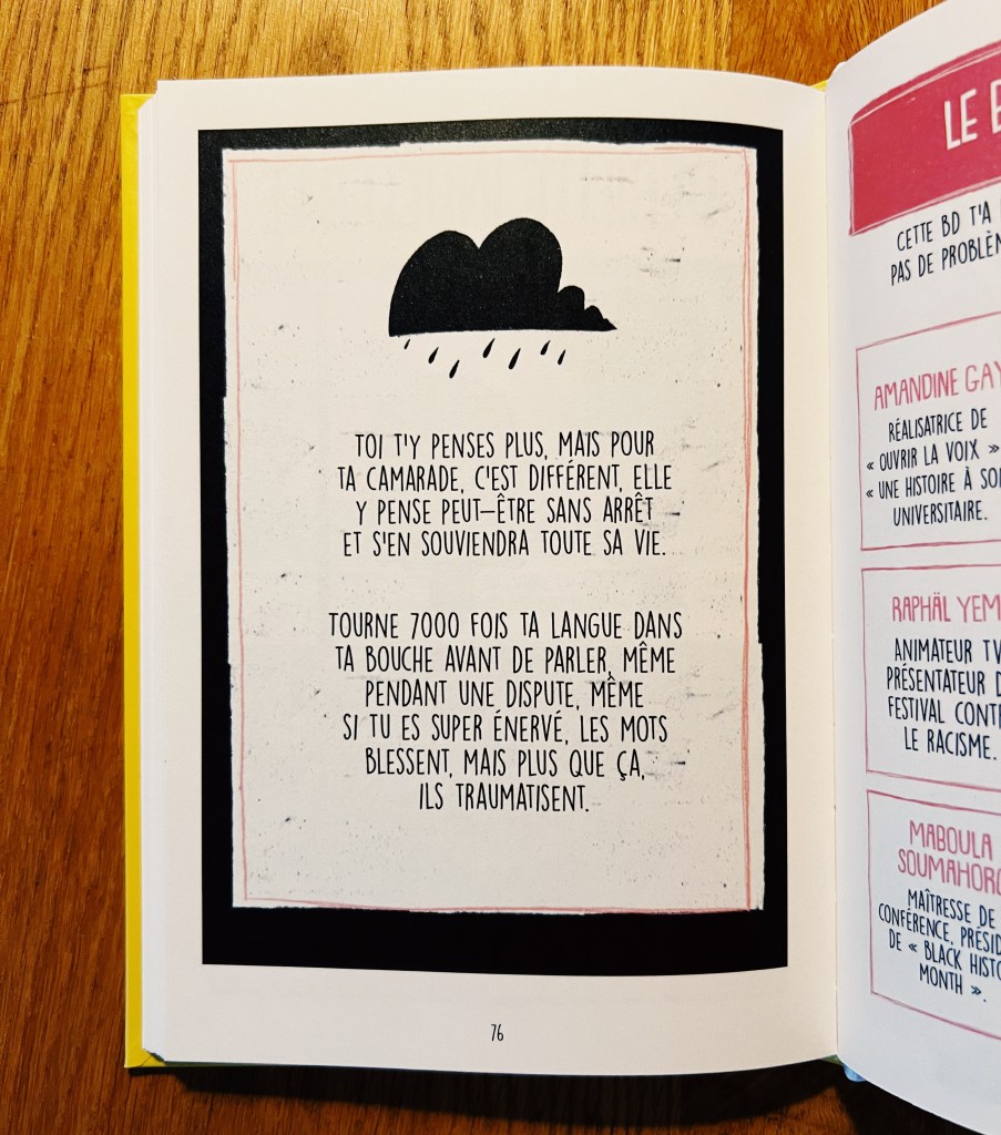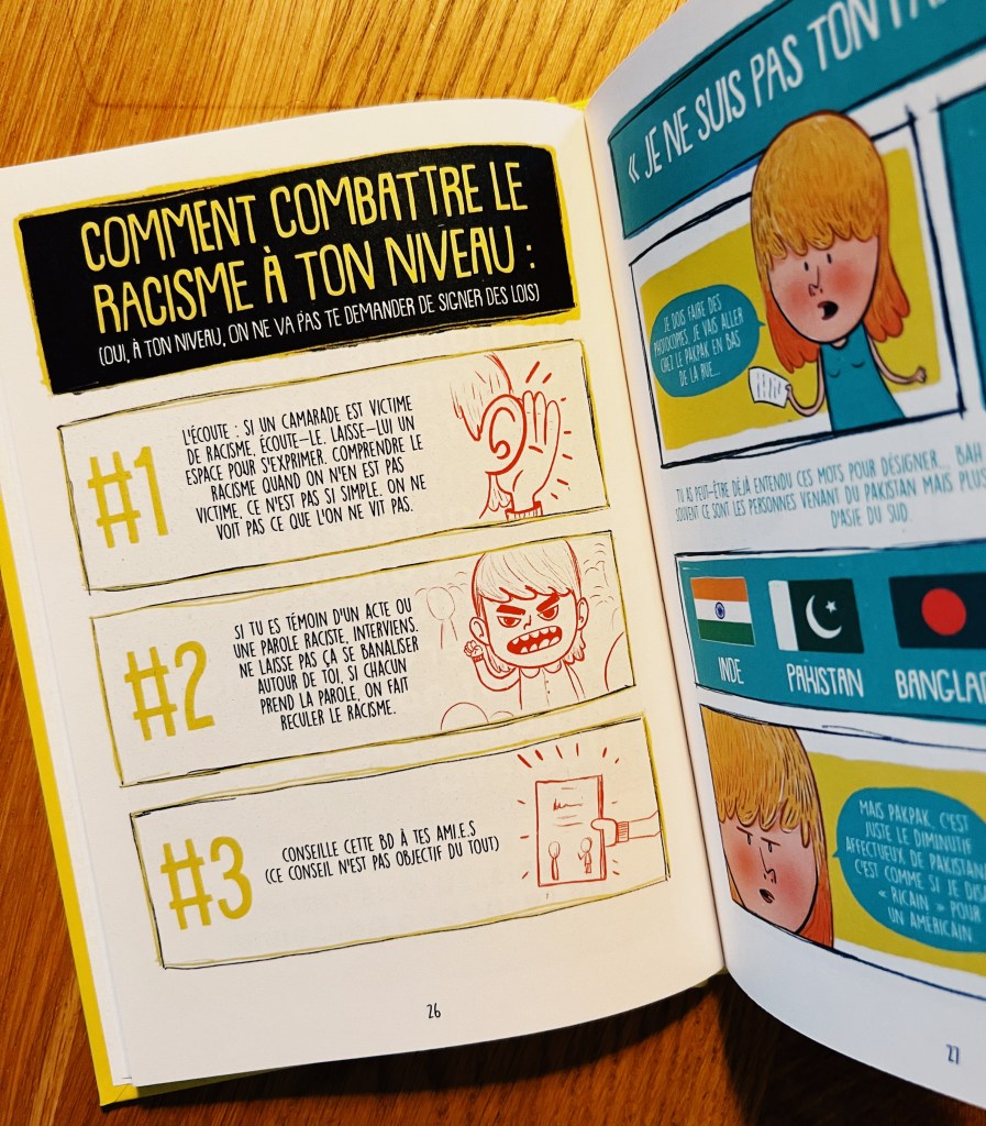 Lโauteur et illustrateur franรงais nous propose ici un petit tour dโhorizon (non exhaustif pour un sujet si vaste il est clair lร -dessus) sur diffรฉrents aspects du racisme exposรฉs avec des mots simples et clairs. Il รฉclaire le regard sur les termes de racisme, xรฉnophobie, stรฉrรฉotype, prรฉjugรฉ, discrimination histoire de sโy retrouve un peu et dโappeler un chat un chat. Il explique la diffรฉrence entre les notions de religion et de race, ce quโest lโintersectionnalitรฉ, le N-word, le blackface, lโattitude ร avoir pour รฉviter de dire nโimporte quoi sans le vouloirโฆ โ