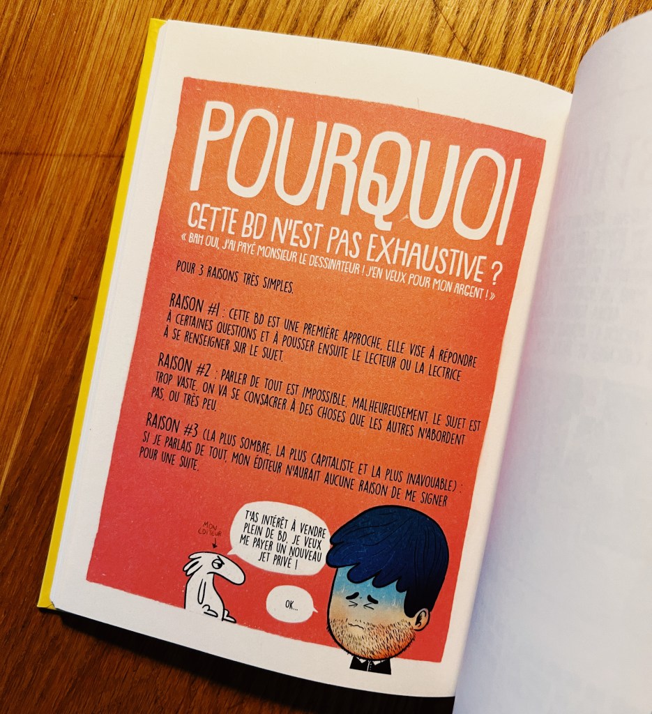 Dans ce livre au format sympa qui se veut drรดle et pรฉdagogique, les planches sont hyper agrรฉables ร lire, ludiques et remplies de petites choses ร dรฉcouvrir qui fait quโon ne sโennuie jamais. On peut le mettre de cรดtรฉ, sโy remettre, sauter un chapitre puis revenir au dรฉbut.. bref un vrai petit doc ร dรฉvorer (mention spรฉciale pour la Confrรฉrie des ouin-ouin !). โ