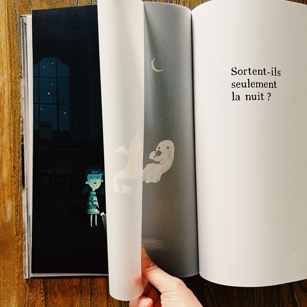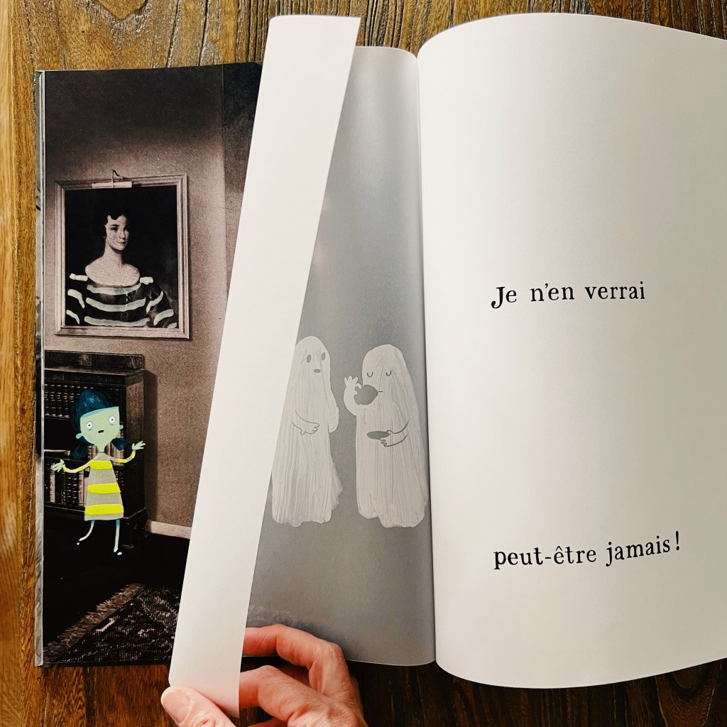 Un très très bel album aux illustrations magnifiques. Le mélange de photos imprimées sur un grain ancien, de dessins colorés pour la petite fille, de feuilles en papier calque qui font apparaître et disparaître les fantômes au gré des pages qu’on tourne…. c’est un livre totalement hypnotisant qui nous est proposé et il plaira à toutes les catégories de lecteur!