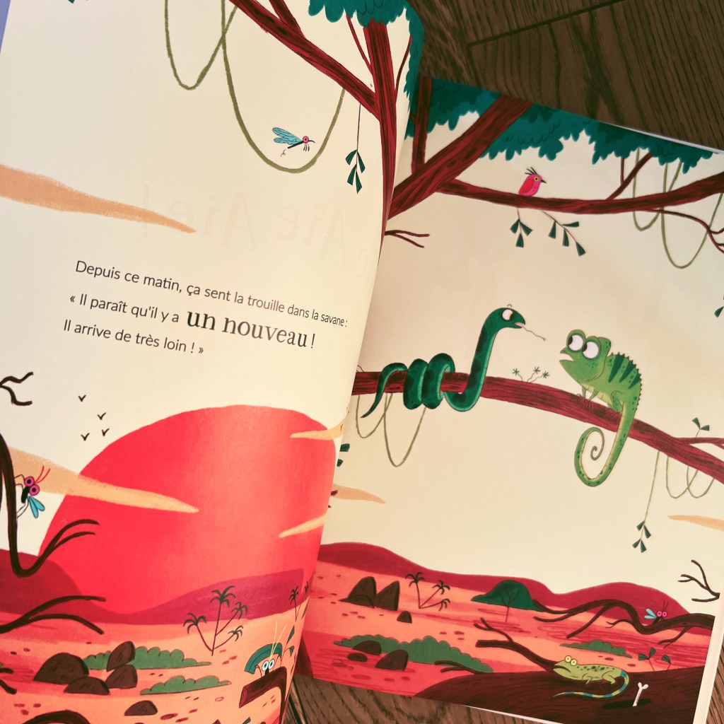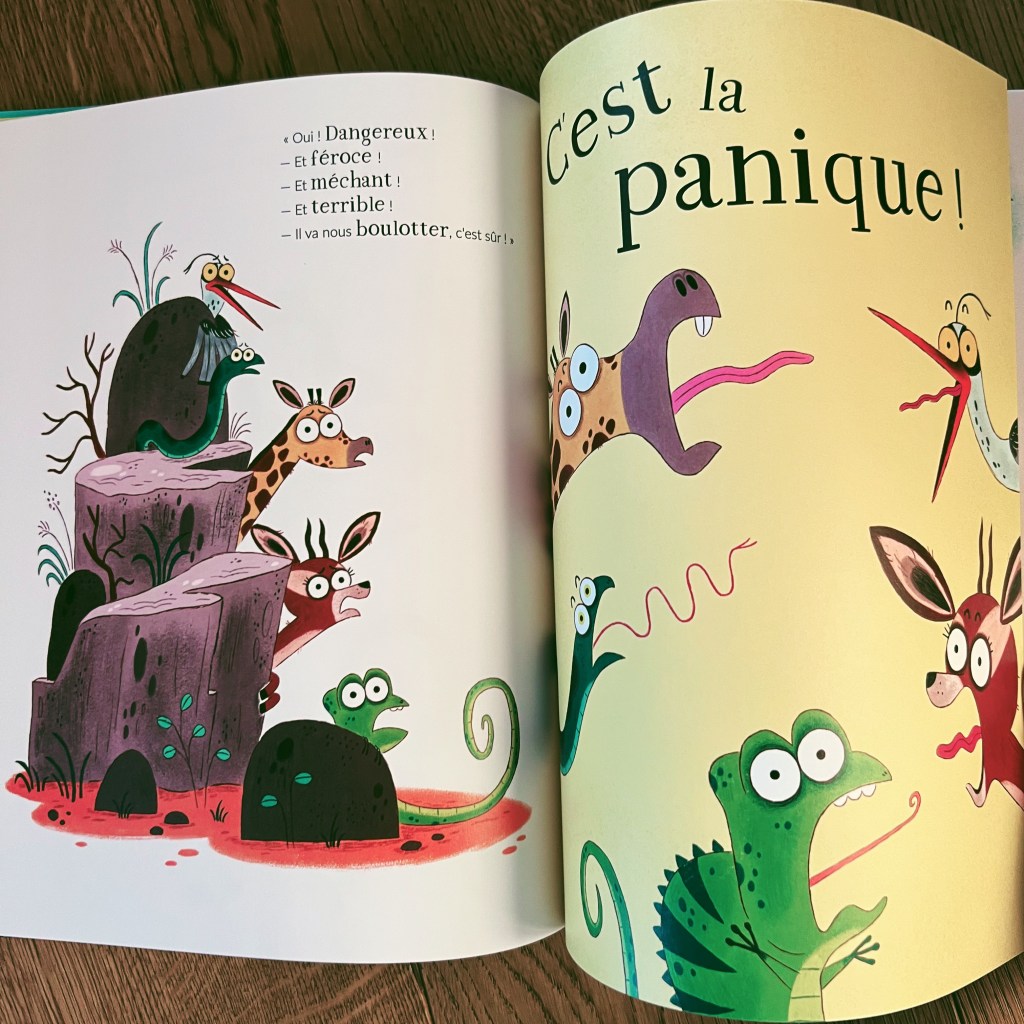 Il paraît qu’un nouveau débarque dans la savane. Et qu’il vient de loin…. Alors chacun y va de ses craintes : il serait féroce, terrible et méchant! Sauvage et féroce et dangereux et .,,,, aïe aïe aïe !!! Tous les indices que les animaux arrivent courageusement à glaner le confirment !!! C’est la panique !!!