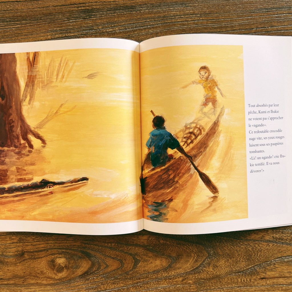 Mais lorsque la saison sèche rend les poissons plus rares, c’est à bord d’une pirogue qu’il faut aller leur proposer des marmites et des vers au bout de la ligne… mais c’est sans compter le ndango, le terrifiant crocodile, maître de la rivière. Heureusement les jeunes congolais apprennent très vite à faire face au danger.