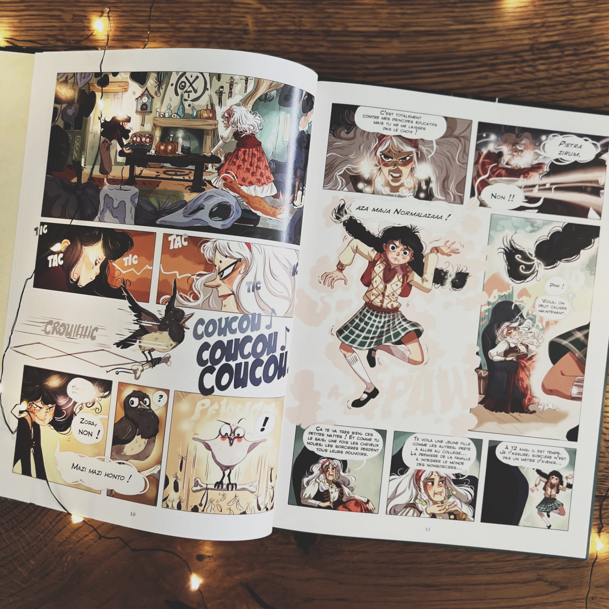 Dans ce premier opus, Une sorcière au collège, on découvre le monde (ou les mondes) où évolue Zora et ça promet bien des rebondissements ! Les personnages sont hauts en couleur et les illustrations très dynamiques et expressives. Quelques blagues un peu convenues mais dans l’ensemble tout est plutôt réussi.