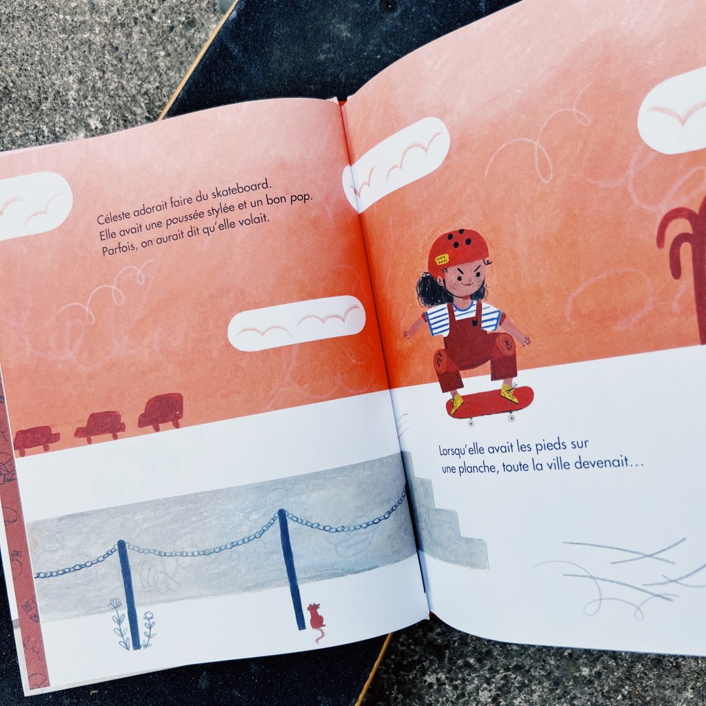 Céleste aime le skate. Elle est douée en plus! Elle se balade dans la ville qui se transforme sous ses roues en terrain de jeu, mais ce qu’elle aime le plus c’est la sensation de voler quand elle s’élance sur son skate.