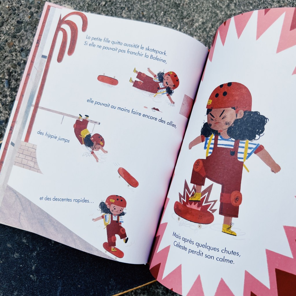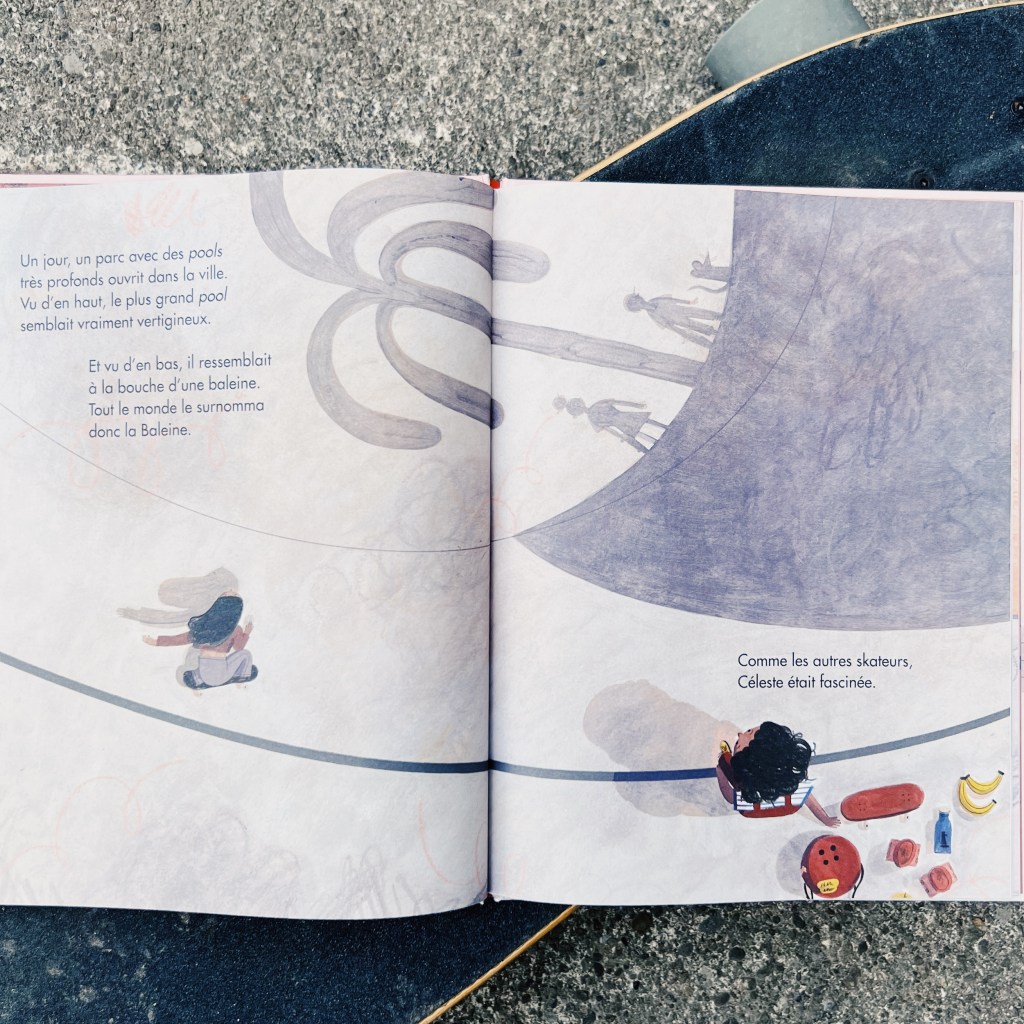 Alors quand un immense skatepark ouvre en ville, avec un très grand pool (une rampe en béton en forme de piscine), Céleste est fascinée! Cette gigantesque rampe ne lui fait pas peur et elle s’élance, comme les autres. Mais la jeune fille a peut-être eu les yeux plus gros que le ventre…