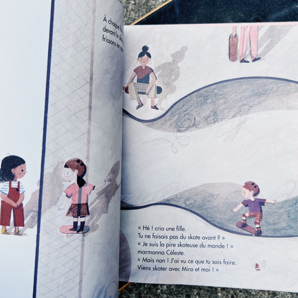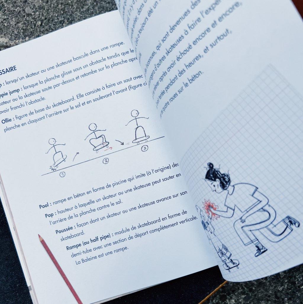 J’ai beaucoup aimé les illustrations dont les décors peuvent faire penser à des dessins d’enfants au crayon, et où les personnages sont trop mignons dans leurs rôles de mini skateurs. Et petit bonus à la fin : un glossaire qui nous permet de nous initier un peu plus au monde du skate cher au cœur de l’autrice!