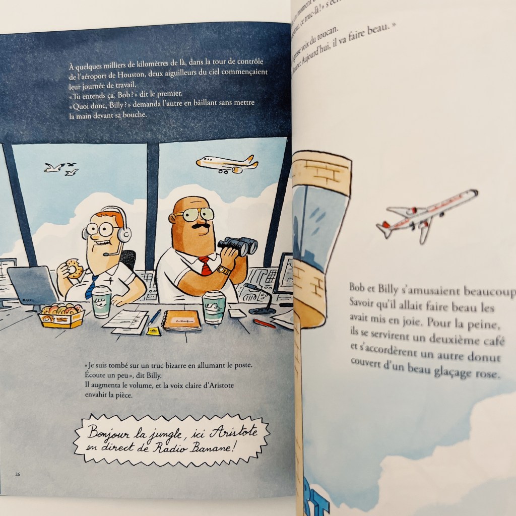 Reprenons dès le début. Départ pour la jungle où le petit singe Aristote, qui aime se promener dans la jungle comme le singe qu’il est, tombe sur la carcasse d’un avion… et surprise! La radio fonctionne! Et Aristote ce qu’il aime, c’est raconter des blagues! Ni une ni deux il commence à utiliser la radio pour faire rire les potentiels auditeurs de l’autre côté des ondes…. vite rejoint par son ami Toucan qui se transforme en Monsieur météo, Ouistiti pour les recettes, Serpent et ses amis pour des concerts du tonnerre !