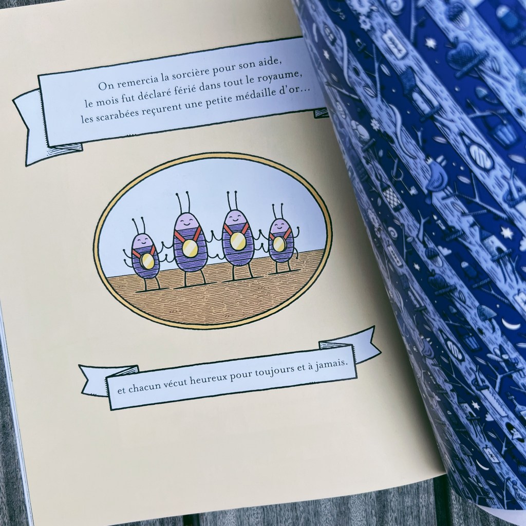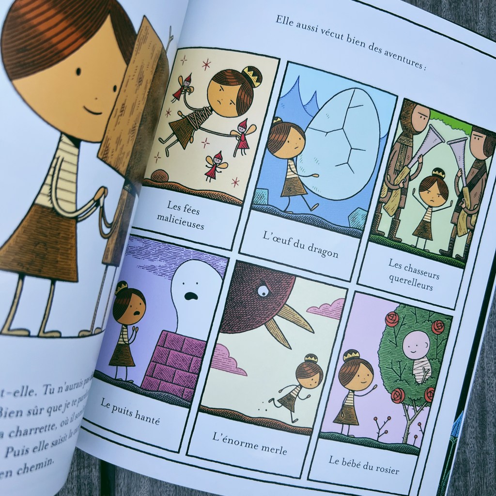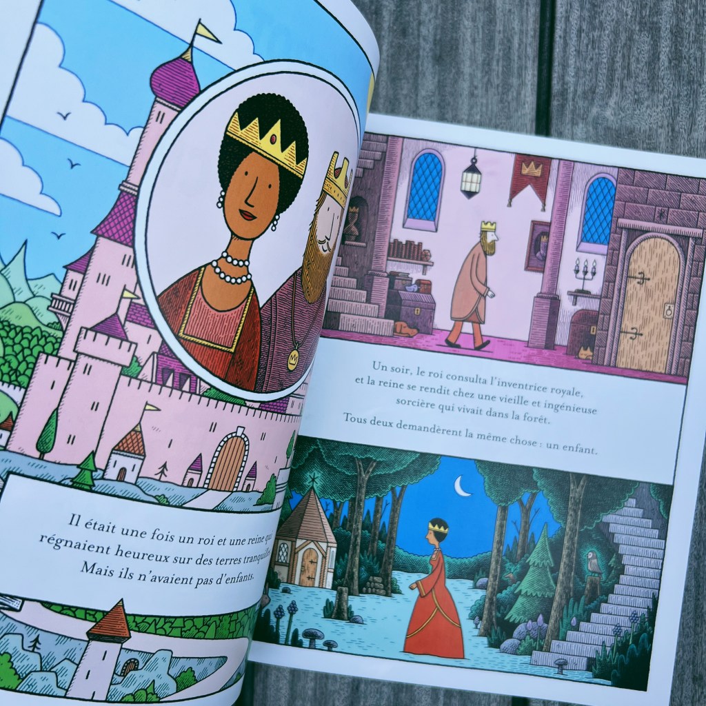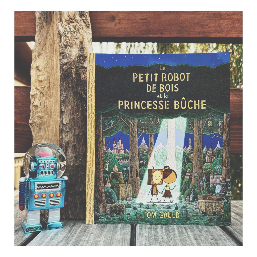 Cet album est une petite merveille. Écrit comme un conte, on assiste à la naissance – magique – du Prince et de la Princesse du royaume car le Roi et la Reine n’arrivent pas à avoir d’enfant. Si l’inventrice créa un petit Prince robot entièrement fait de bois, la sorcière donna vie à une bûche de bois pour en faire une jolie Princesse. Mais la seule contrainte est que la petite fille redevient une bûche chaque soir et qu’une formule magique doit être prononcée chaque matin pour lui redonner vie. Facile jusque là.