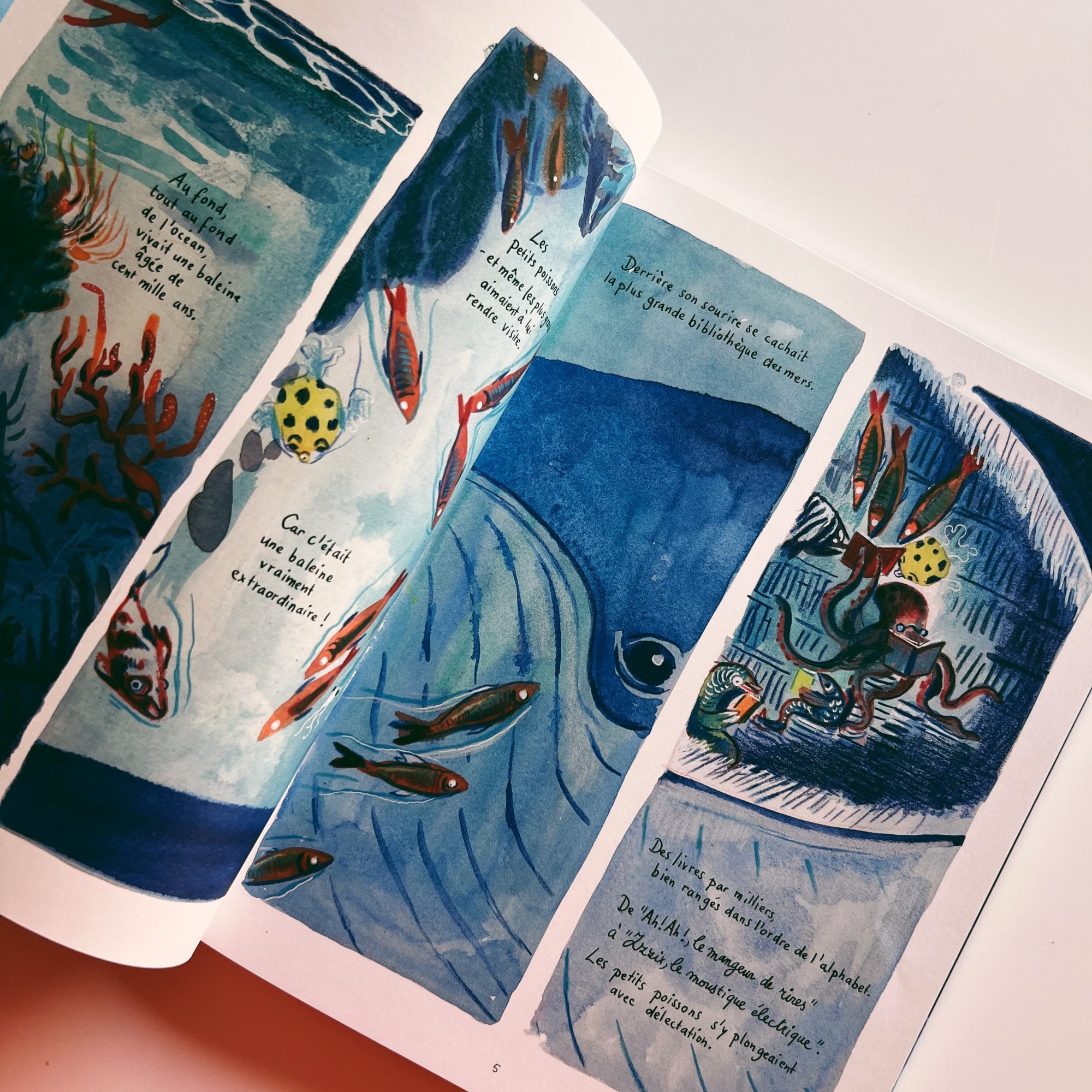 Ils aiment tous deux les lettres et détestent les histoires qui finissent mal. Il faut dire que la baleine cache en elle un trésor : la plus grande bibliothèque qu’on pourrait imaginer ! Tenue par une tortue de mer assistée d’une pieuvre où on peut croiser un requin plongé dans un roman qui parle certainement de capes et d’épées… Et c’est avec émotion, lors de sa première rencontre avec le facteur, qu’elle lui propose un livre qui raconte « l’histoire d’une sirène qui tombe amoureux d’un pirate ». Qui finit bien évidemment.