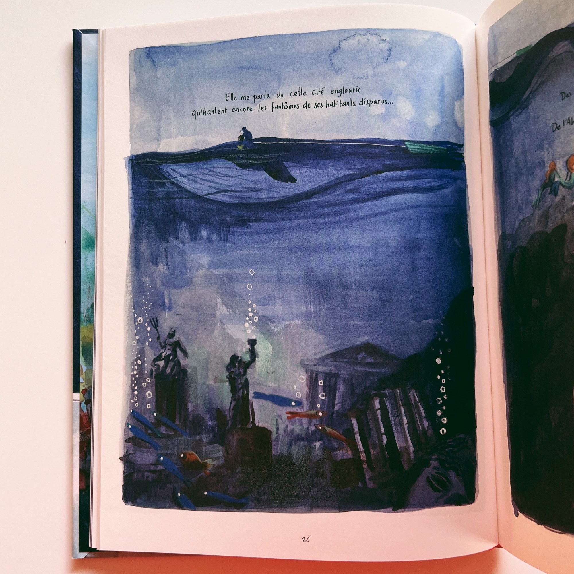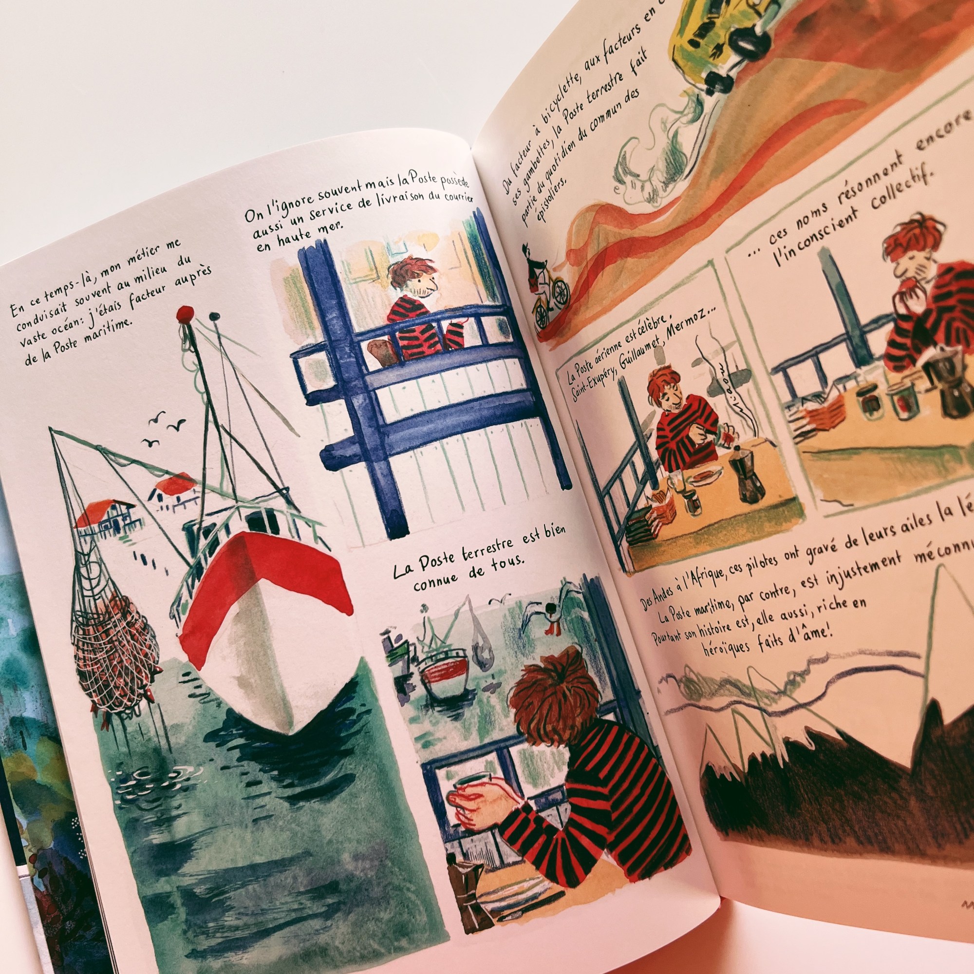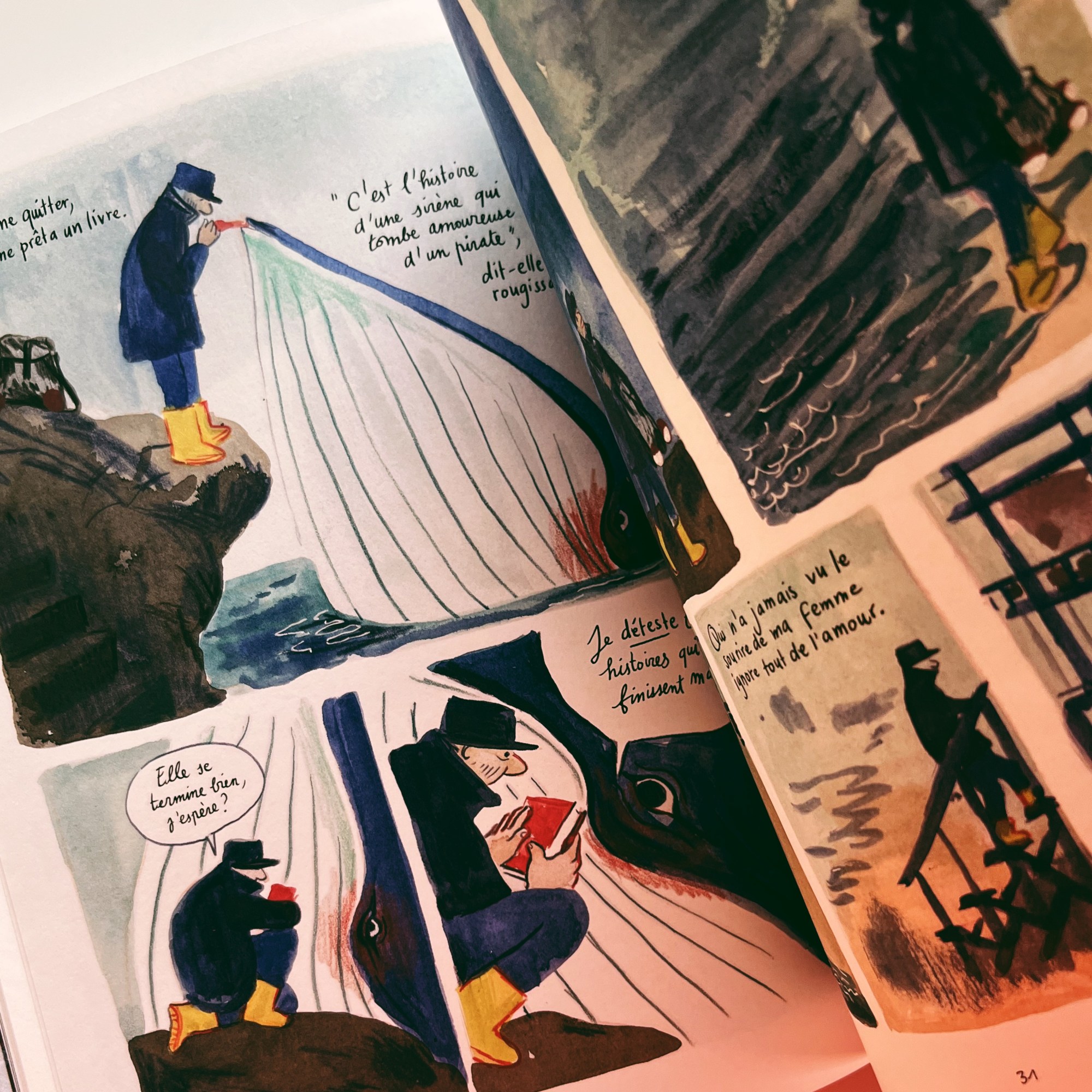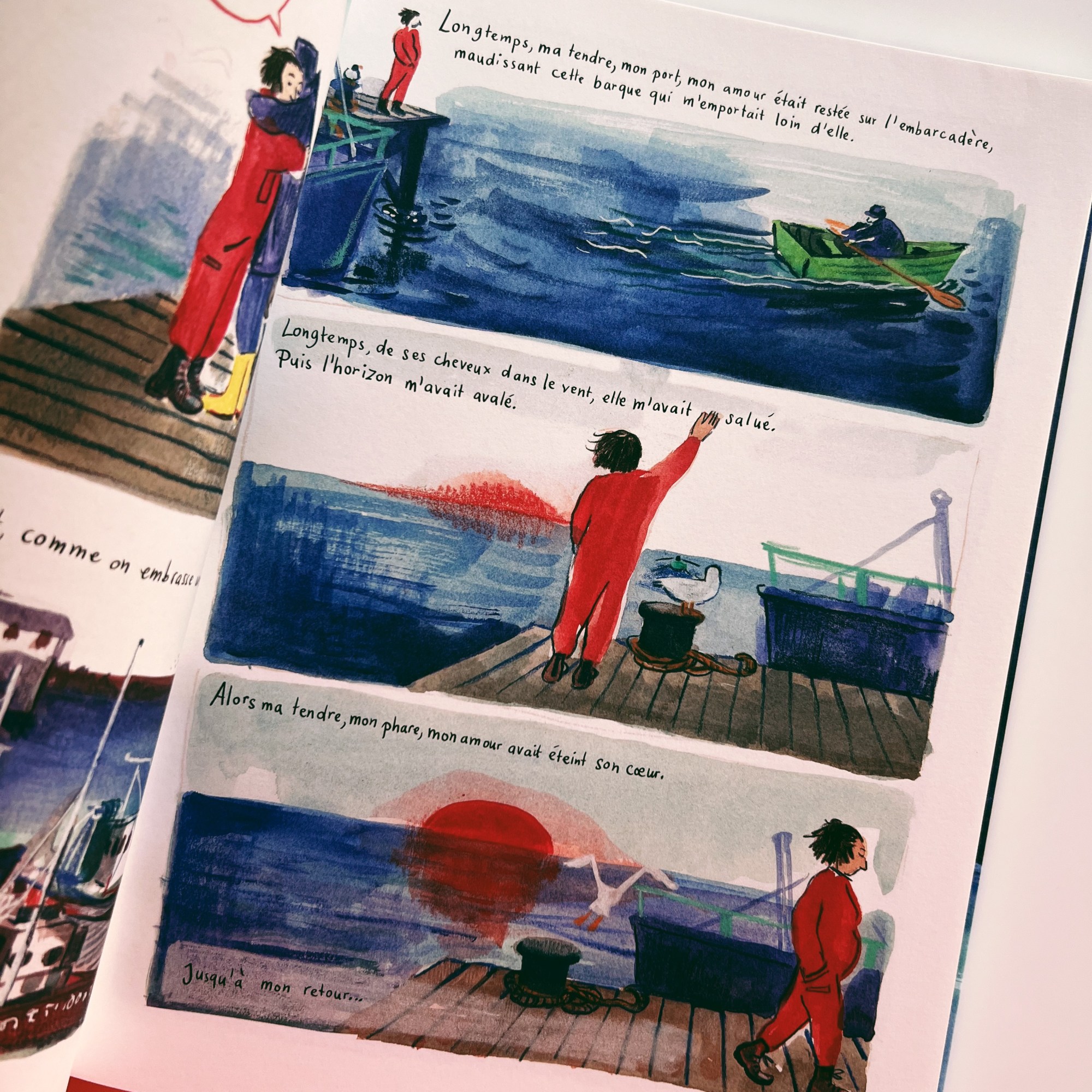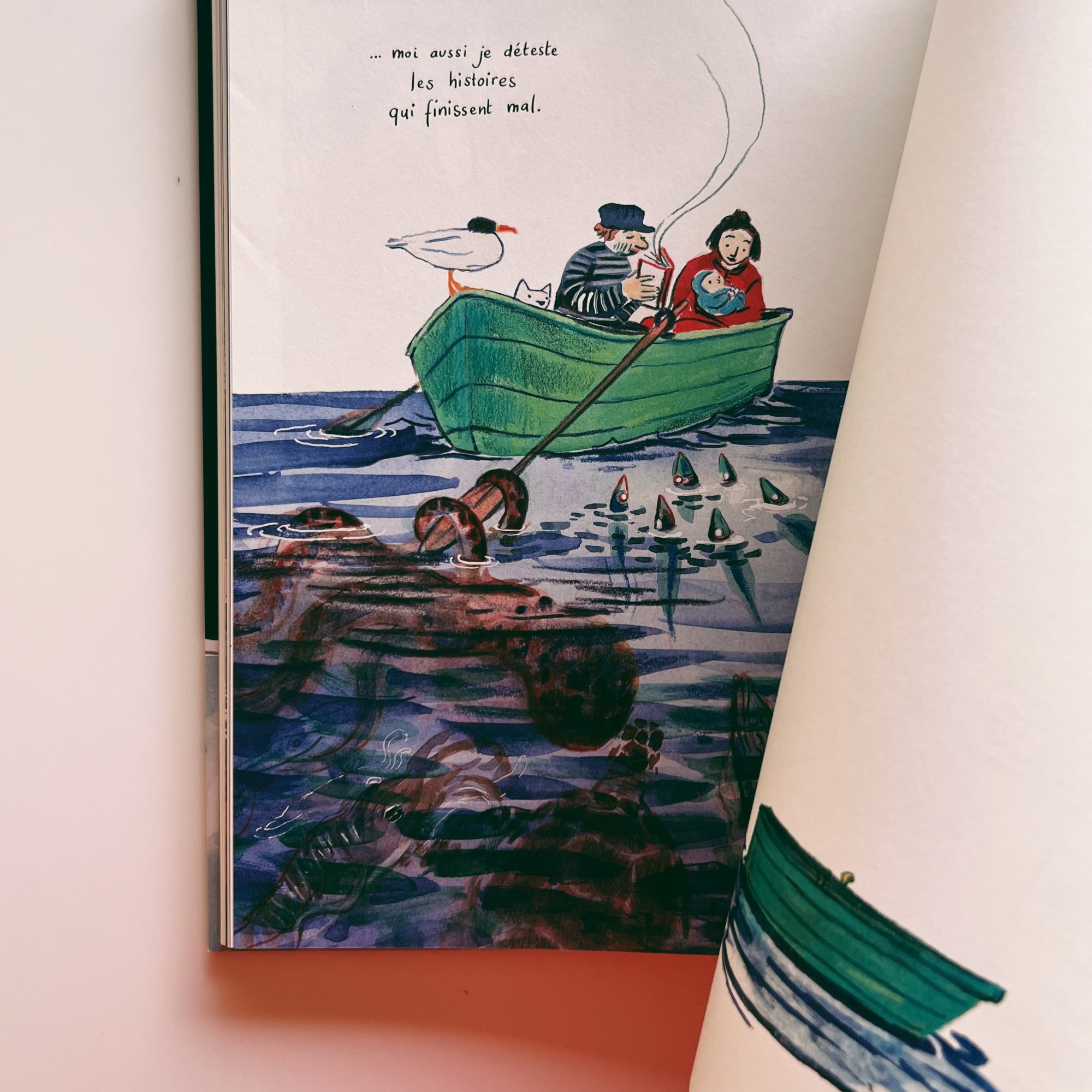 Un album faussement candide, destiné aux enfants mais pas vraiment, qui s’adresse aux adultes mais surtout à leur âme d’enfant… un ovni graphique qui nous emmène au gré des vagues et qui déploie des histoires entre terre ferme et océan de poésie.