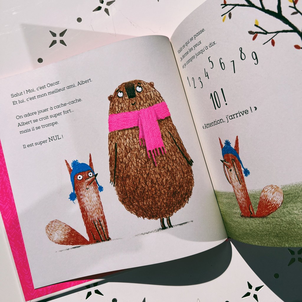 Albert est le meilleur copain d’Oscar. Et Oscar est le meilleur copain d’Albert. Et leur jeu préféré à tous les deux c’est le cache-cache ! Mais Oscar, qui est un renard et donc rusé comme tous les renards, trouve Albert à tous les coups. Parce qu’Albert est un ours et donc pataud et costaud comme tous les ours, et qu’il n’est pas vraiment fait pour se cacher correctement…